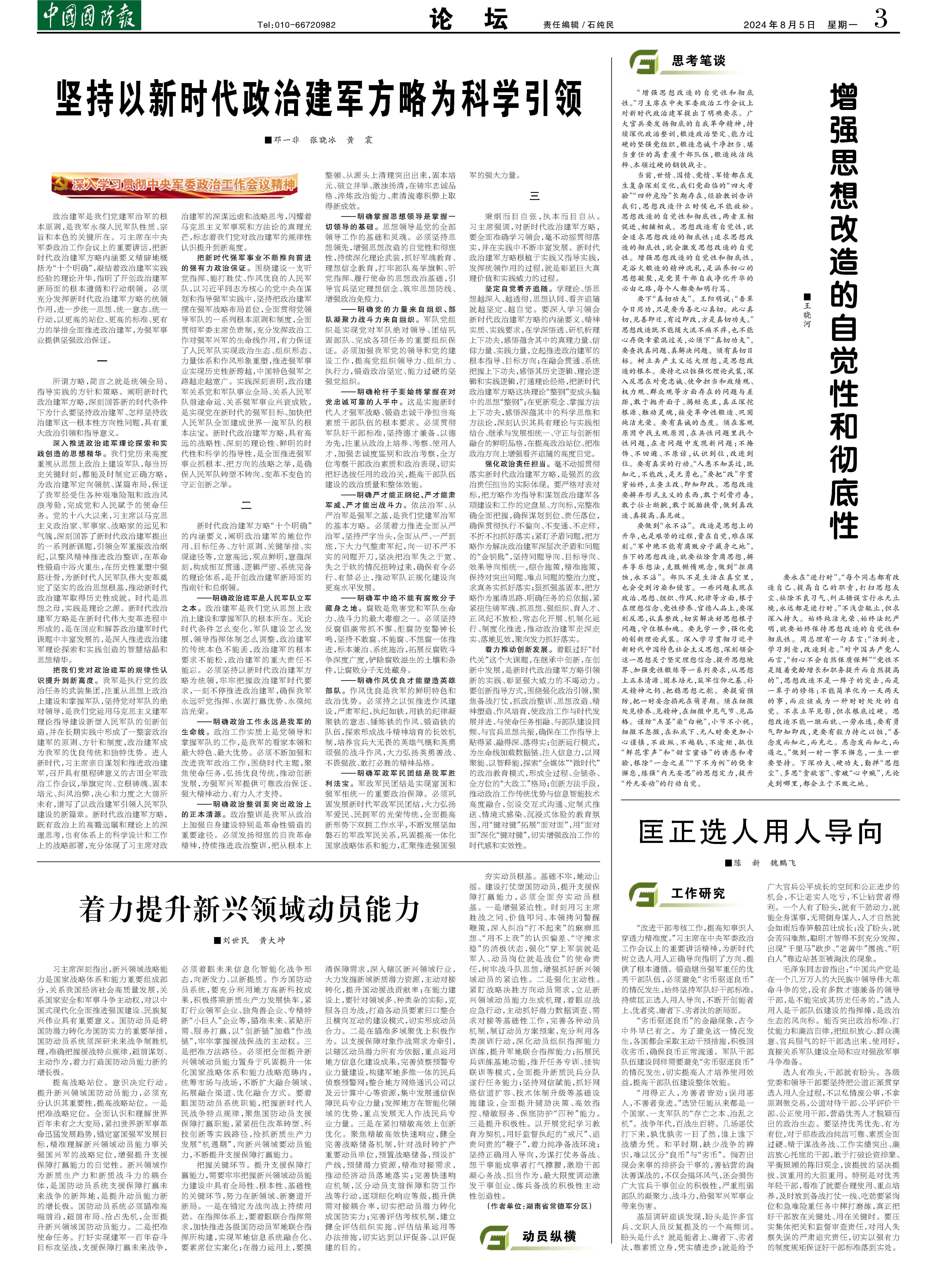 习主席深刻指出,新兴领域战略能力是国家战略体系和能力重要组成部分,关系我国经济社会高质量发展,关系国家安全和军事斗争主动权,对以中国式现代化全面推进强国建设、民族复兴伟业具有重要意义。国防动员是将国防潜力转化为国防实力的重要举措,国防动员系统须深研未来战争制胜机理,准确把握援战特点规律,超前谋划、主动作为,着力打造国防动员能力新的增长极。