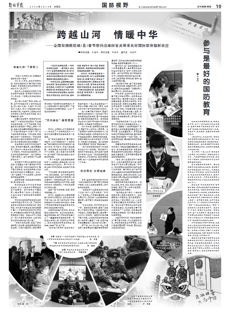 细细品味双拥模范城(县)党政机关干部、大中小学师生和乡村社区群众,在慰问活动中国防观念悄然“生根发芽”的过程,记者感触很深的一点是,身在其中、参与进来,是最好的国防教育方式。