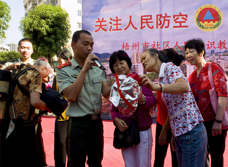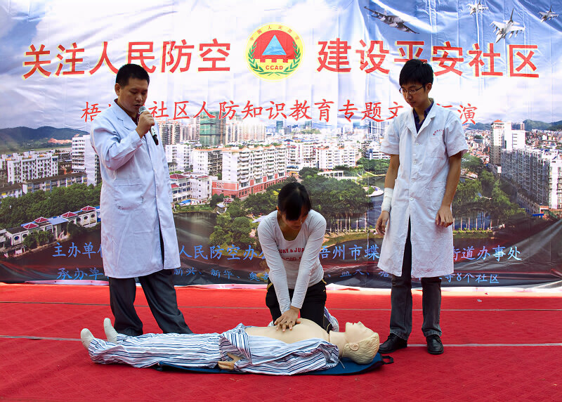 社区宣传教育中,我们选择以市区人口较多的蝶山区角嘴街道办事处辖的九个社区为重点,播放人防宣传专题片,在社区居民出入活动场所悬挂宣传横幅,摆放宣传展板,张贴标语及出版墙报,组织人防志愿者向社区居民演示防空防灾技能,侧重提高居民在战时和应急情况下自救和互救的意识和技能,受到群众广泛欢迎。