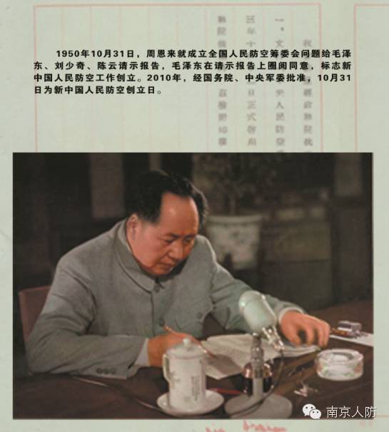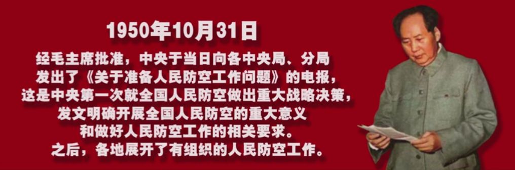 1950年10月31日,周恩来总理召集聂荣臻、薄一波等同志研究全国的防空问题,这是中央首次研究全国的人民防空工作;当日,经毛泽东主席批准,中央致电各中央局、分局《关于准备人民防空工作问题》, 这是中央第一次发文明确开展全国人民防空的重大意义和做好人民防空工作的相关要求。之后,全国范围内展开了有组织的人民防空工作。