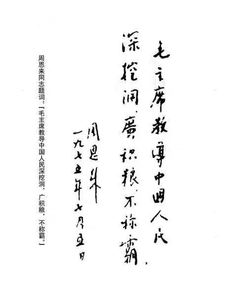 深挖洞、广积粮、不称霸,成为国家安全发展的战略思想,成为一切工作的指导方针。尤其是深挖洞,迅速在全国大中城市展开,一场防护工程建设的人民战争在中国打响。1975年7月5日,身患癌症的周总理,最后一次用毛笔书写了“毛主席教导中国人民,深挖洞,广积粮,不称霸”的题词,充分体现了共和国的缔造者对国家、对人民的无限热爱和对人民防空事业的深切关怀。