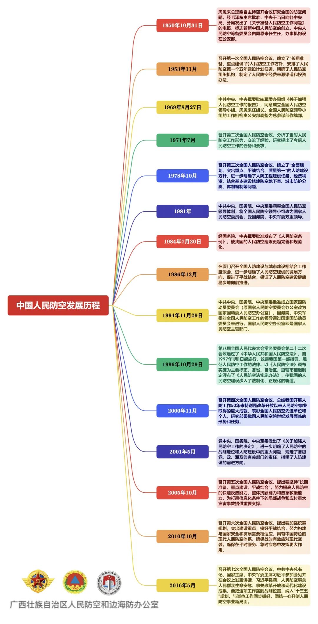 你知道我国这72年来发生了哪些人防大事件吗?人民防空有着怎样的历史?接下来让我们一起通过思维导图来回顾人民防空的发展历程。