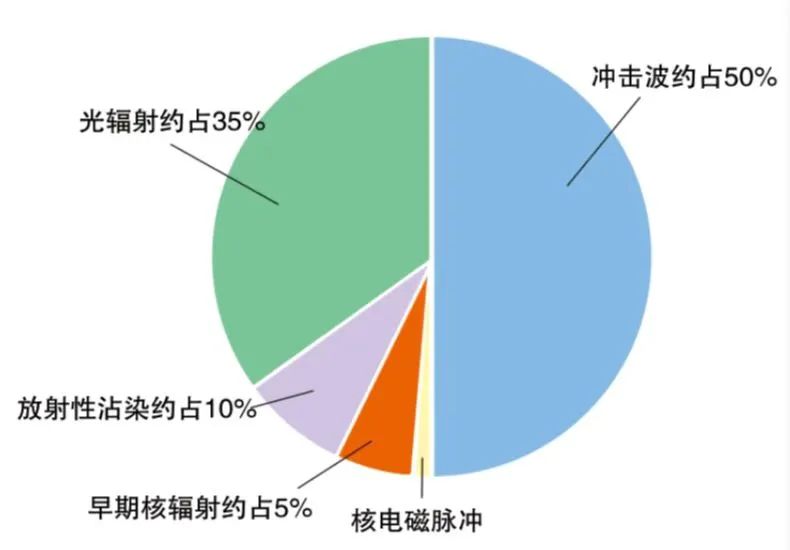 核武器爆炸对人员和物体造成的杀伤破坏作用及效果,又称毁伤效应。造成杀伤破坏的主要因素有:光辐射、冲击波、早期核辐射、核电磁脉冲和放射性沾染。