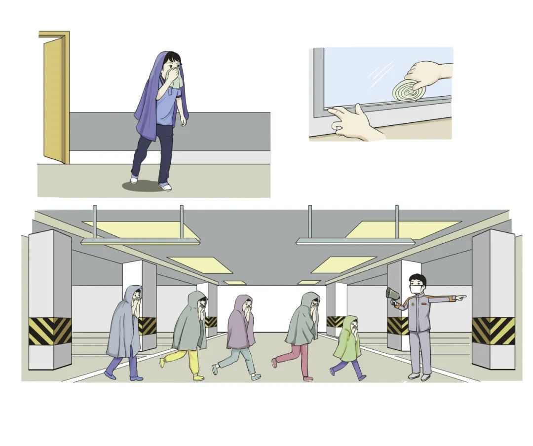及时戴好防毒面具或口罩,或用毛巾捂住口鼻,扎好领口、袖口、裤口,或用雨衣、塑料布、床罩等身边容易得到的物品把暴露的皮肤遮盖起来;或直接躲进可掩蔽的人防工程内,尽量避免在室外活动;在室内的人员,应立即关好门窗,贴上封条,堵住孔口,密封食品和饮用水,进入地下室或建筑物中心房间。