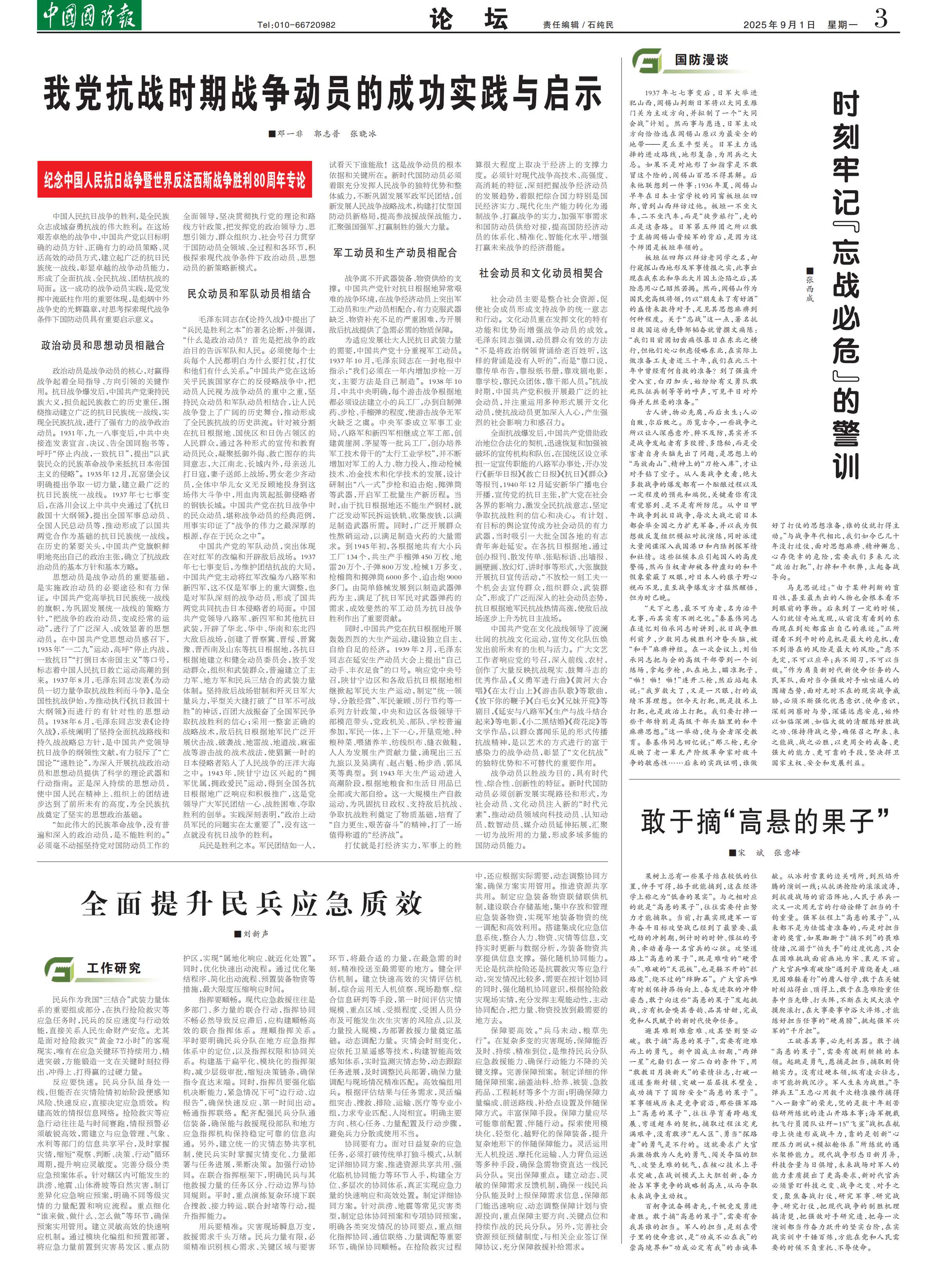 中国人民抗日战争的胜利,是全民族众志成城奋勇抗战的伟大胜利。在这场艰苦卓绝的战争中,中国共产党以目标明确的动员方针、正确有力的动员策略、灵活高效的动员方式,建立起广泛的抗日民族统一战线,彰显卓越的战争动员能力,形成了全面抗战、全民抗战、团结抗战的局面。这一成功的战争动员实践,是党发挥中流砥柱作用的重要体现,是彪炳中外战争史的光辉篇章,对思考探索现代战争条件下国防动员具有重要启示意义。