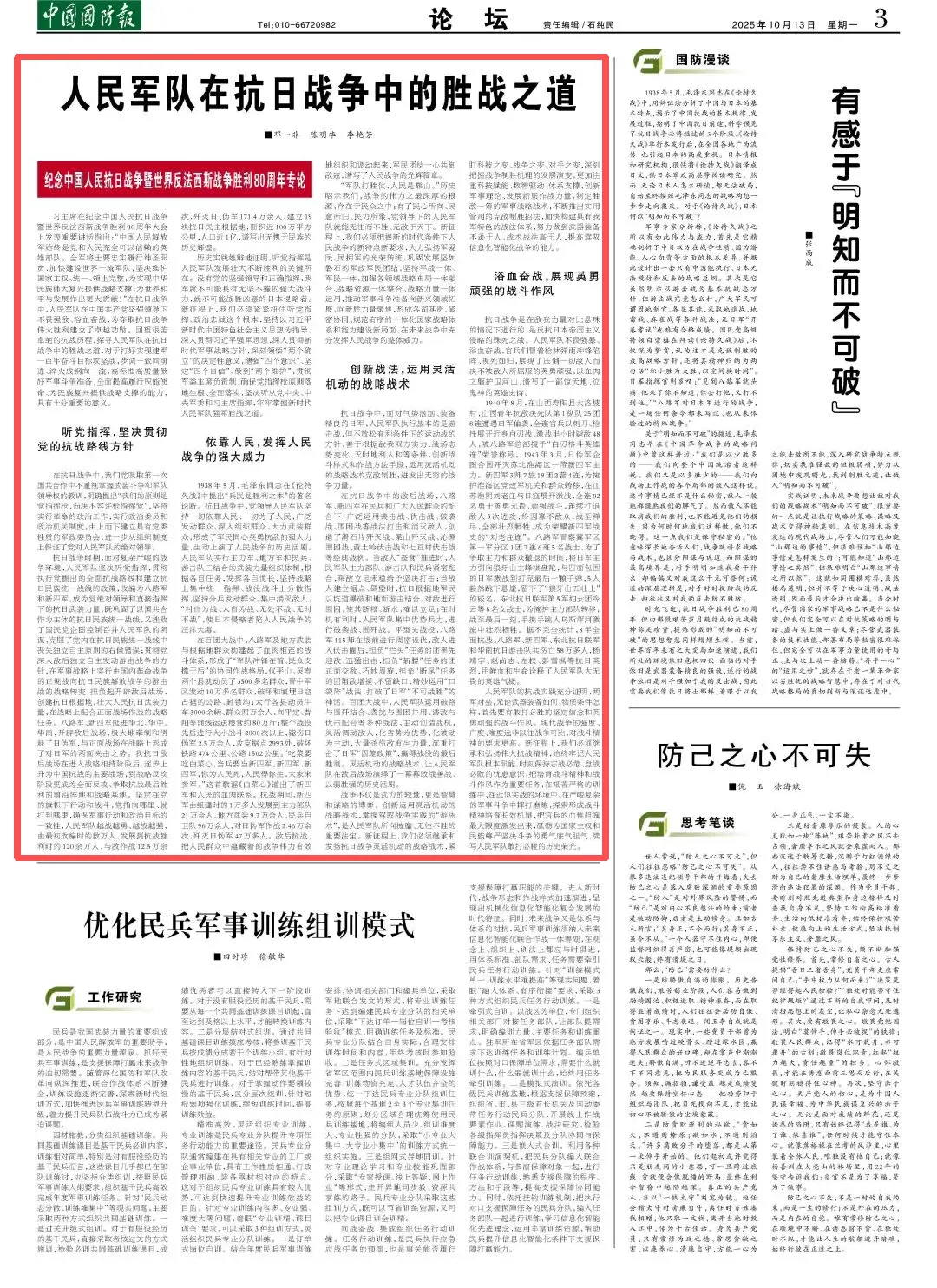 习近平总书记在纪念中国人民抗日战争暨世界反法西斯战争胜利80周年大会上发表重要讲话指出:“中国人民解放军始终是党和人民完全可以信赖的英雄部队。全军将士要忠实履行神圣职责,加快建设世界一流军队,坚决维护国家主权、统一、领土完整,为实现中华民族伟大复兴提供战略支撑,为世界和平与发展作出更大贡献!”在抗日战争中,人民军队在中国共产党坚强领导下不畏强敌、浴血奋战,为夺取抗日战争伟大胜利建立了卓越功勋。回望艰苦卓绝的抗战历程,探寻人民军队在抗日战争中的胜战之道,对于打好实现建军一百年奋斗目标攻坚战,步调一致向前进、淬火成钢向一流,高标准高质量做好军事斗争准备,全面提高履行职能使命、为民族复兴提供战略支撑的能力,具有十分重要的意义。