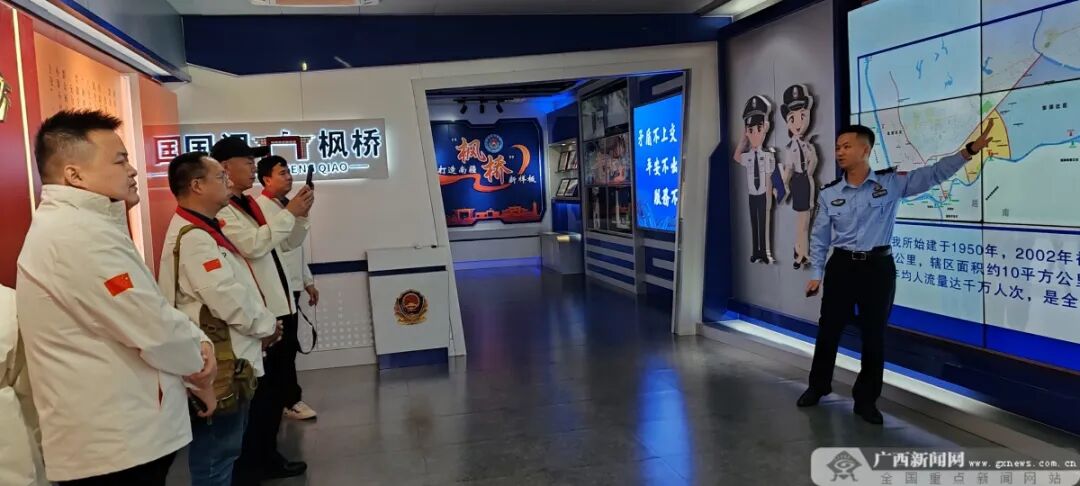 11月3日,2025年“走边关”之“卫国戍边有我”主题深度宣传采访团走进全国第三批“枫桥式公安派出所”——防城港边境管理支队东兴边境派出所,实地探访该所国门警务站坚持和发展新时代“枫桥经验”的创新实践。采访团深入采访该所国门警务站靠前服务中外游客、调解涉外矛盾纠纷等先进事迹,跟随“国门枫桥义警队”的脚步,见证新时代“枫桥经验”在祖国南疆落地生根的生动景象。