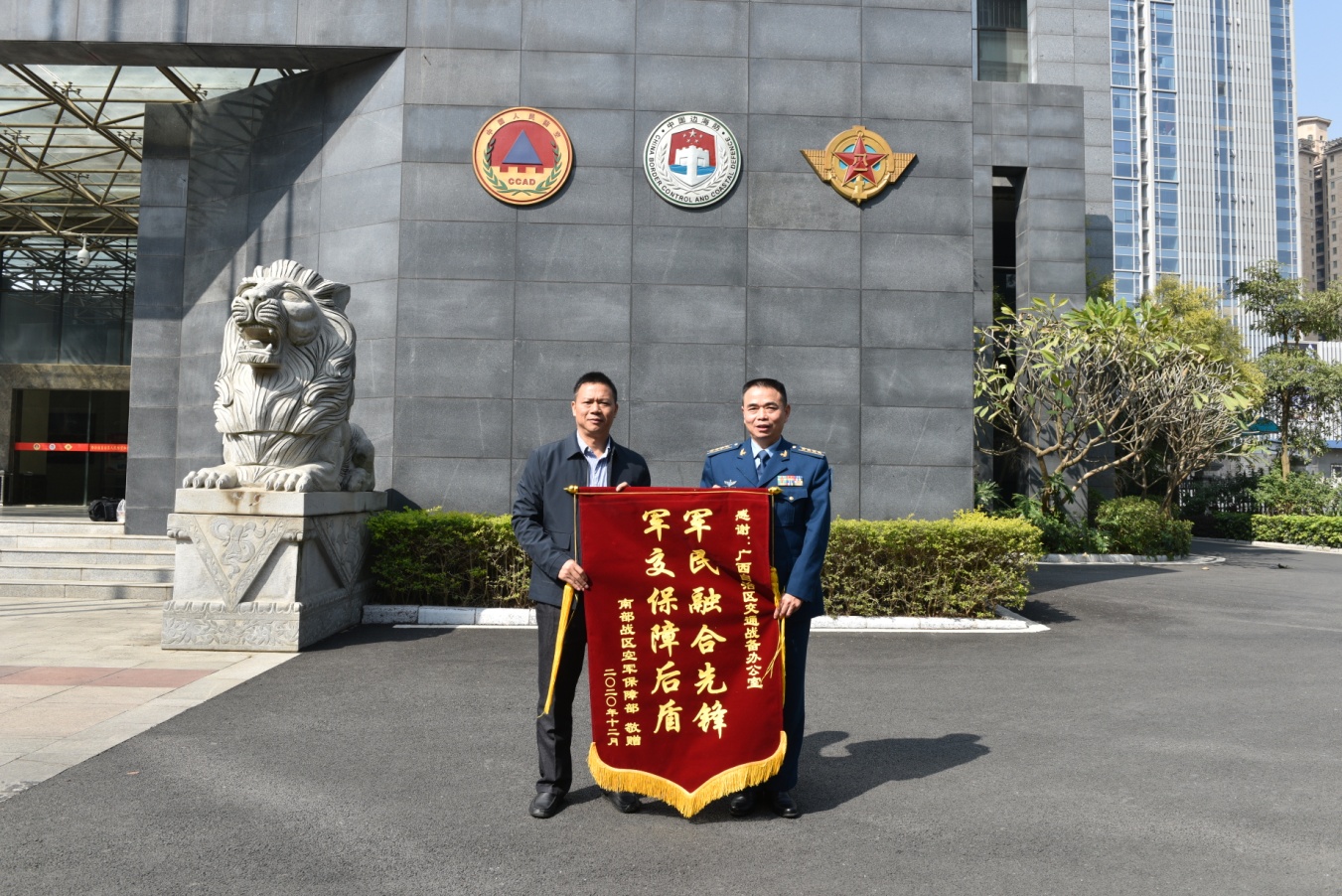 图为黄学兵代表南部战区空军保障部向自治区人防边海防办赠送锦旗