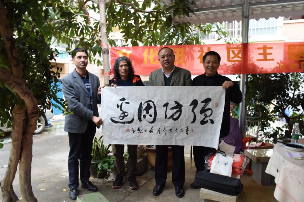 12月26日上午九点整,知名书法家苏亚就、郭广胜老师就开始现场为居民书写春联送祝福,党员志愿者也开始了修电脑、义诊和人防知识宣传活动。活动现场,飘满墨香、热闹非凡,上百副春联承载了中华民族浓浓的春节情感。蔡中平同志为居民送新春祝福,随后在福建园街道蒋生利主任和尧头岭社区党委黄海惠书记的陪同下,慰问困难家庭和困难学生,为他们送上慰问金及学习用品。
