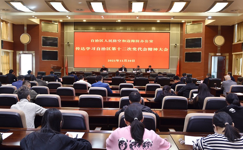 11月30日上午,自治区人防边海防办召开会议,组织机关各处、直属单位传达学习自治区第十二次党代会精神,办党组书记、主任蔡中平主持大会并讲话。
