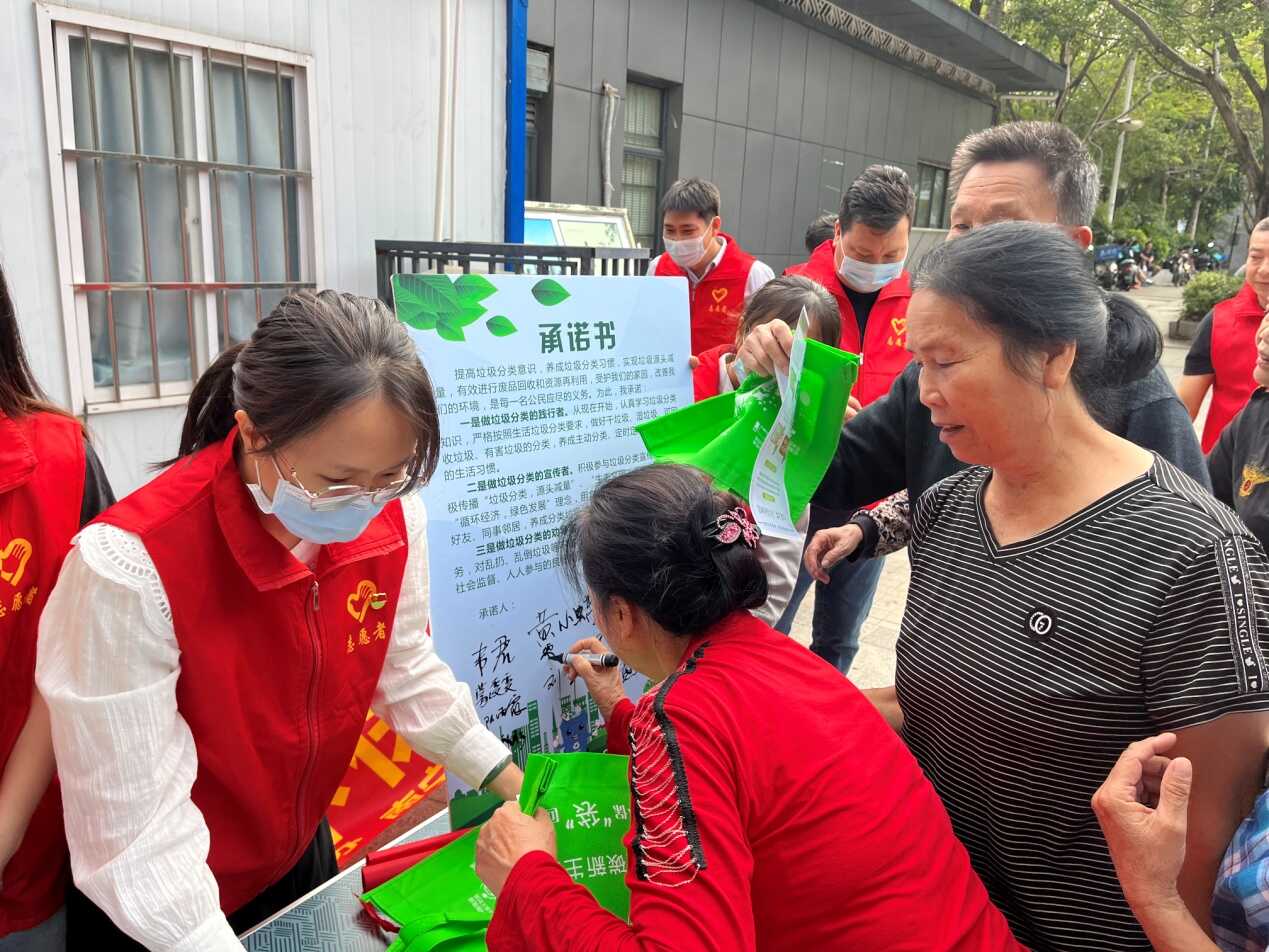 活动现场,志愿者向过往居民发放生活垃圾分类宣传资料和环保购物袋,引导居民签署垃圾分类承诺书,详细讲解生活垃圾分类的重要性、资源回收利用、废弃物处置等环保知识,并解答居民在生活中遇到的分类难题,帮助群众深入了解生活垃圾分类,进一步提高生活垃圾分类知晓率、参与度、投放准确率。