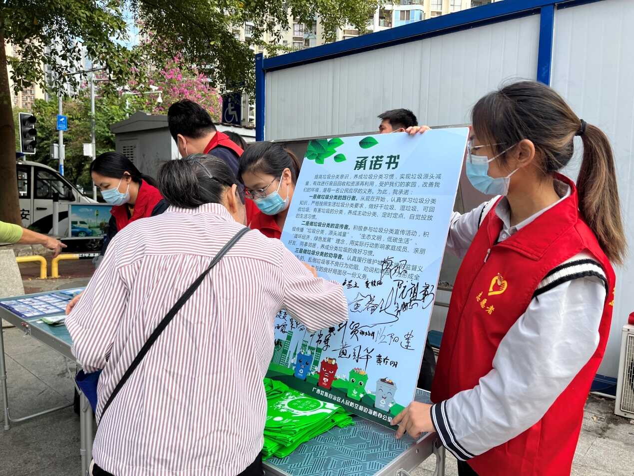 为提高生活垃圾投放质量,让绿色、低碳、环保的理念深入人心,11月3日,自治区人防边海防办联合南宁市青秀区桂花社区居委会在青秀区国锋广场开展“垃圾分类齐参与 绿色环保入人心”主题宣传活动。