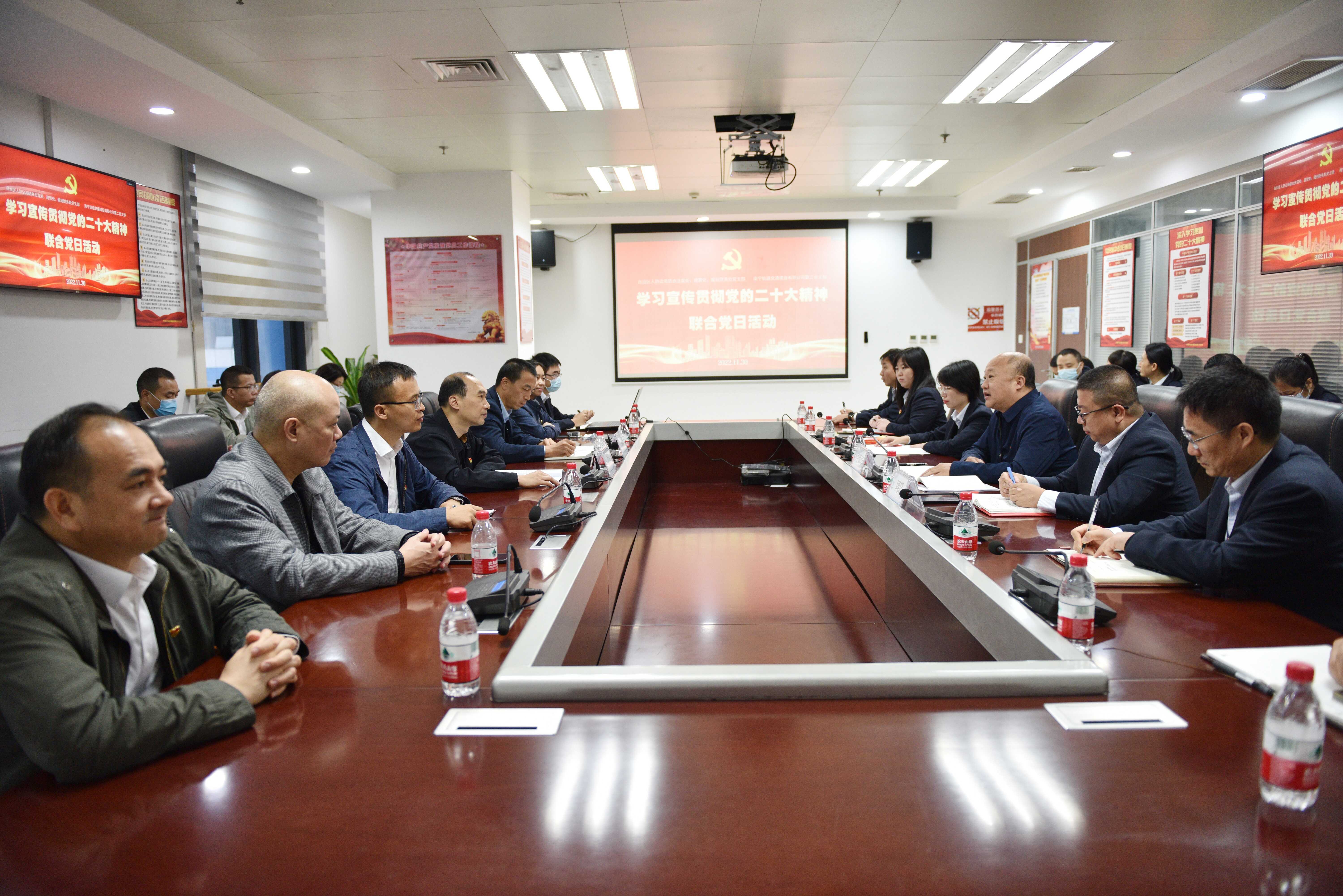 在宪法宣传周来临之际,为深入学习贯彻党的二十大精神和习近平法治思想,努力构建“资源共享、优势互补、互相促进、共同提高”的党建工作新格局,实现以党建促业务促发展的良好局面,11月30日,自治区人防边海防办法宣处、规划财务处、建管处党支部联合南宁轨道交通建设有限公司第二党支部开展学习宣传贯彻党的二十大精神党日活动暨“党建引领、法治同行”宪法宣传周活动,四个党支部共36名党员参加。