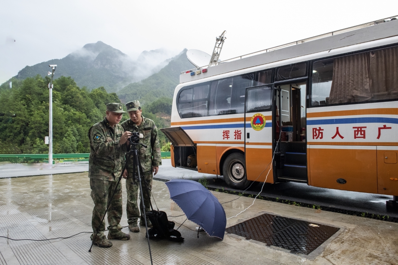 图为参演人员在机动指挥车旁操作单兵设备