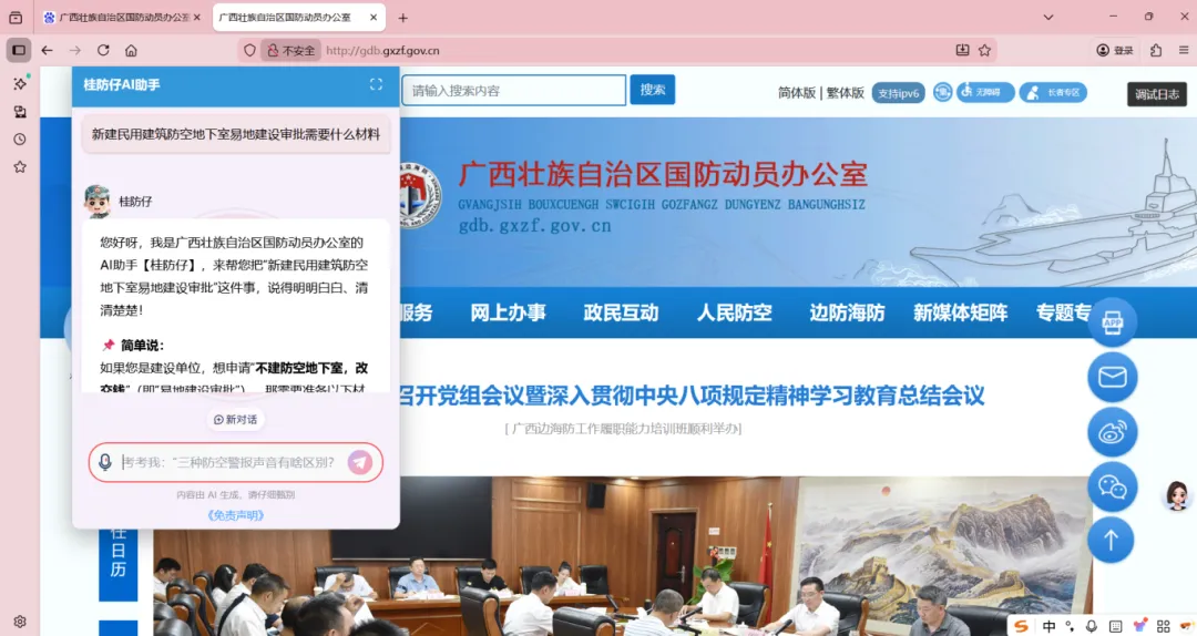 图为在广西壮族自治区国防动员办公室官网上部署“桂防仔AI助手”
