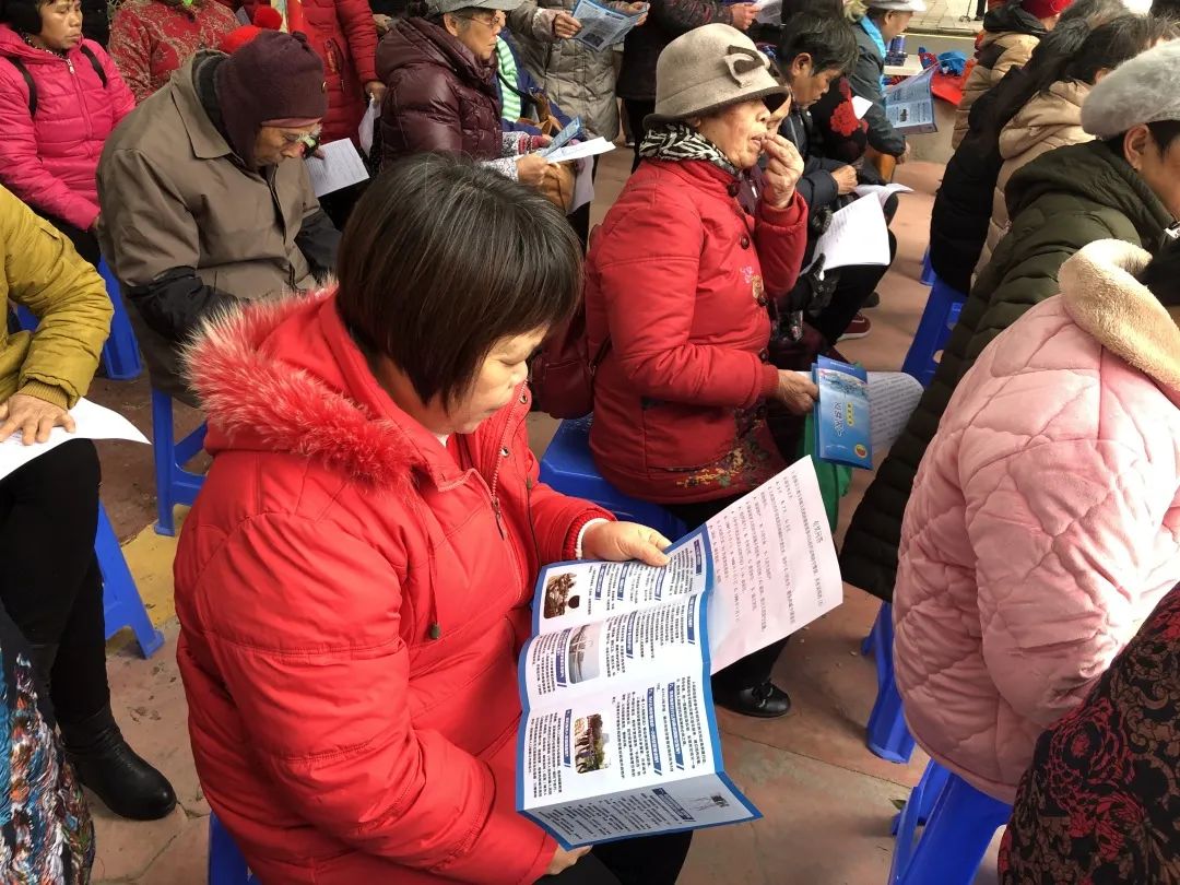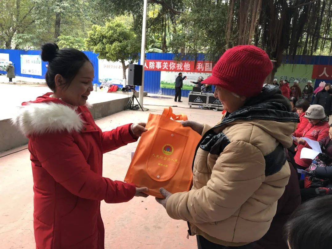工作人员向社区居民分发印有人防标识的购物手提袋和人防知识宣传手册