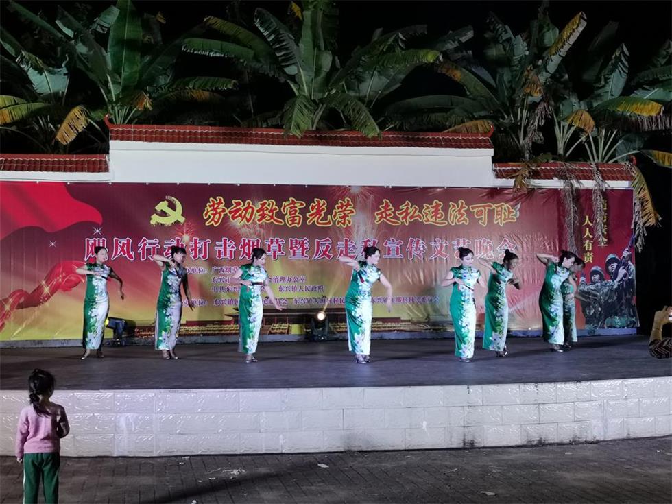 防城港东兴市边海人防局与广西烟草打私总队、东兴镇人民政府举办“飓风行动”打击烟草走私暨反走私宣传文艺晚会联合宣传边境法律法规。