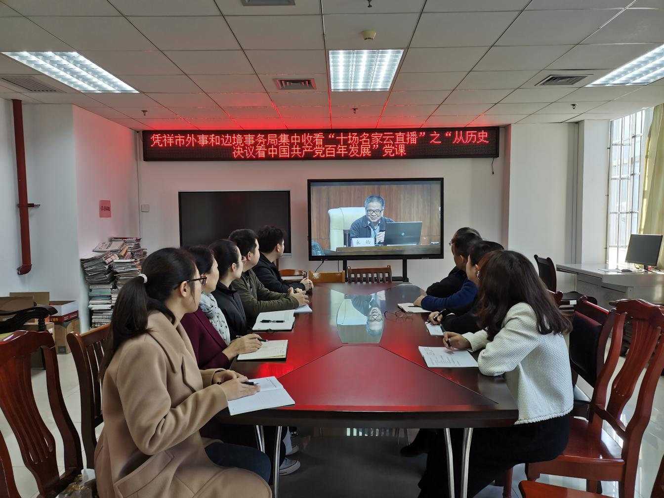 12月3日上午,凭祥市外事和边境事务局党支部组织党员干部收看“十场名家云直播”之“从历史决议看中国共产党百年发展”云直播党课,深入学习贯彻党的十九届六中全会精神,扎实推进党史学习教育走深走实。
