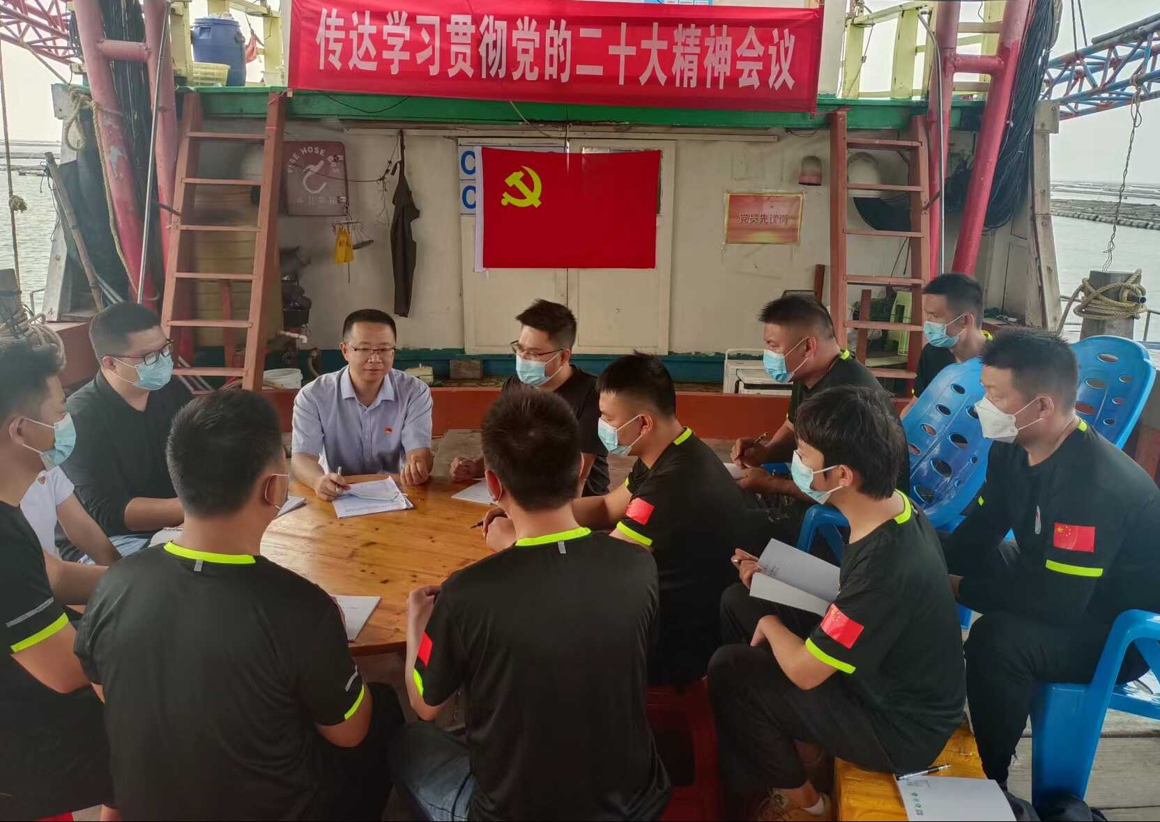 11月11日,港口区人民检察院党组书记、检察长黄纯登上红沙湾海域巡逻封控组执勤趸船宣讲党的二十大精神,港口区外事和海防人防局党组书记、局长刘晓东主持,港口区人民检察院、外事和海防人防局及趸船全体执勤人员参会。