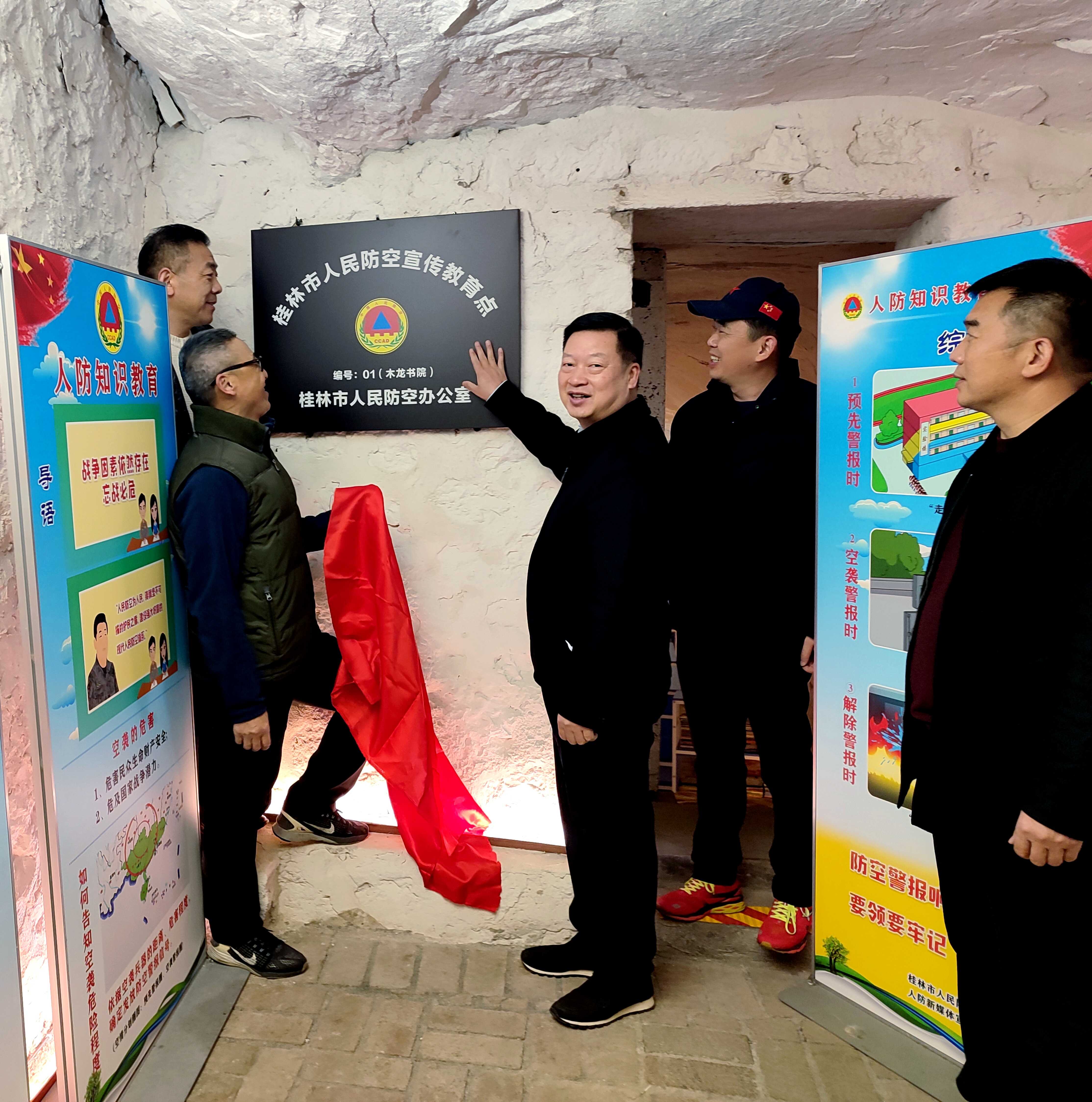 12月20日,桂林市人民防空宣传教育点(01号)揭牌仪式在叠彩山附近漓江畔的木龙书院成功举行。这是桂林市首个在人防岩洞建设的人民防空宣传教育点。该教育点建设在叠彩山下由防空洞改造而成的“网红打卡点”木龙书院中,虽然面积不大,但集人防知识科普、成果展示、防空武器科普、防护装备科普于一体,通过书籍、图片、灯箱、实物实景等媒介渲染,并依托木龙书院较高的人气,可较好地向公众进行人防知识宣传教育。