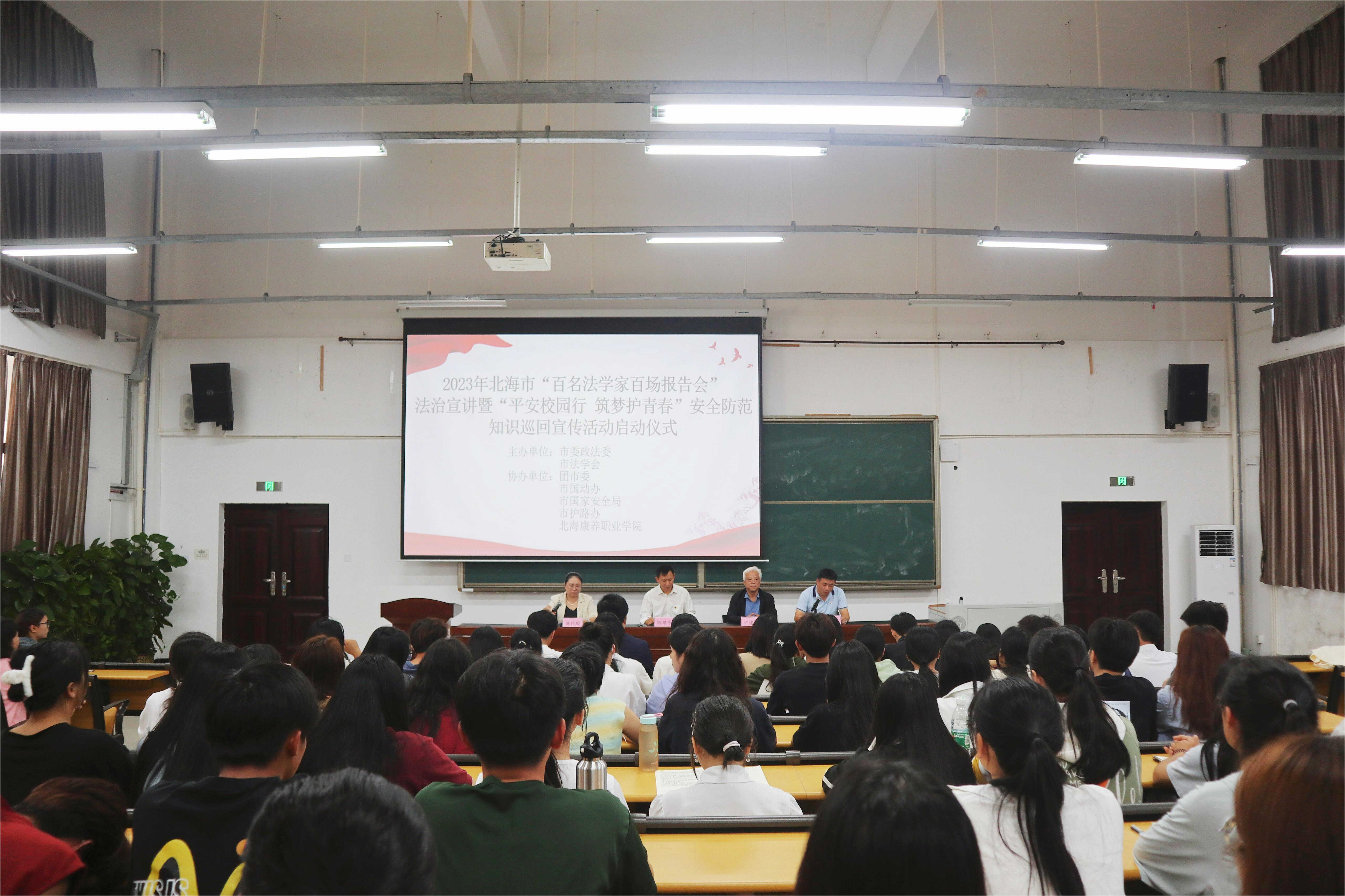 近日,北海市国动办联合市委政法委、市法学会、市国安局等单位走进市康养职业学院,开展“2023年北海市“百名法学家百场报告会”法治宣讲暨“平安校园行 筑梦护青春”安全防范知识巡回宣传活动。