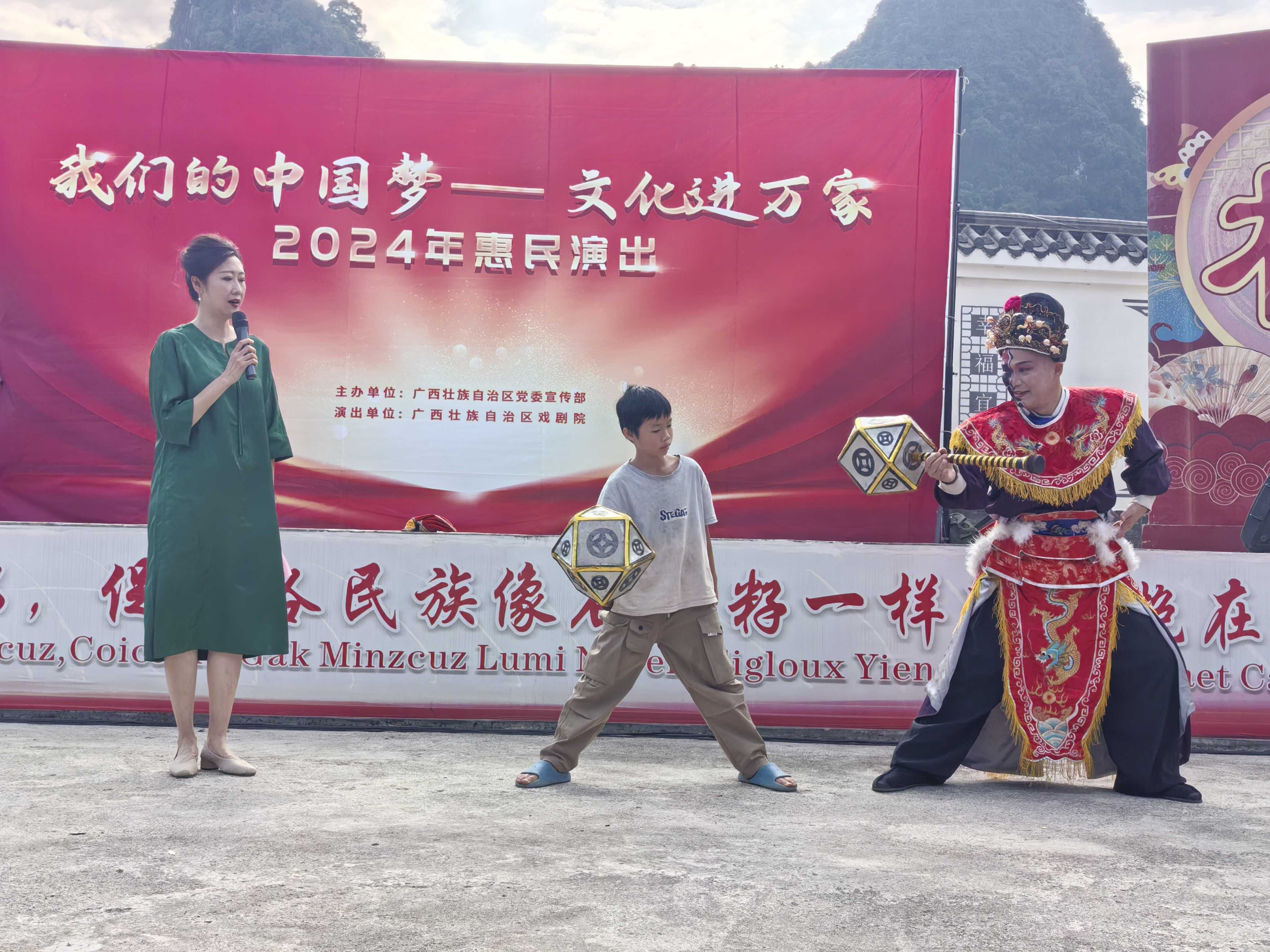 11月23日,广西戏剧院桂剧团“我们的中国梦”——文化进万家惠民演出在下雷镇仁益村上吞屯举行,演出节目丰富多彩、形式多样,吸引100余名村民观看,全场气氛热烈。