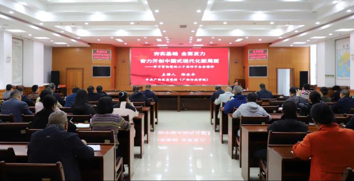 12月1日,南宁市国动办召开学习贯彻党的二十届四中全会精神宣讲会,邀请中共广西区委党校文史教研部副主任、副教授郑永丰授课,全体党员领导干部参加。