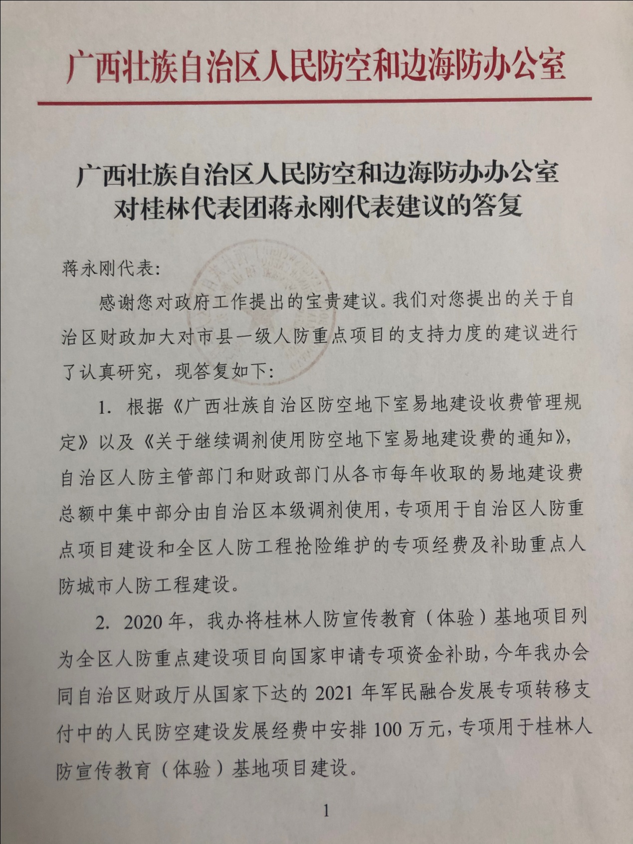 广西壮族自治区人民防空和边海防办公室对桂林代表团蒋永刚代表建议的答复