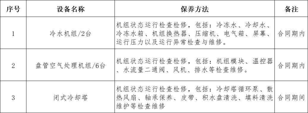某工程除湿机制冷、调温、除湿、电控系统的维护保养、冷凝排水管道系统的疏通保养、水冷冷凝器的清洗维护保养、室内蒸发器清洗维护、蒸发风机检查及维护、初、中效过滤袋清洗维护、机组损坏配件的更换、机组正常使用所必须的制冷剂的补充,配电设备的维修和紧急故障抢修,重大活动或节假日现场保障(设备详见附件)。