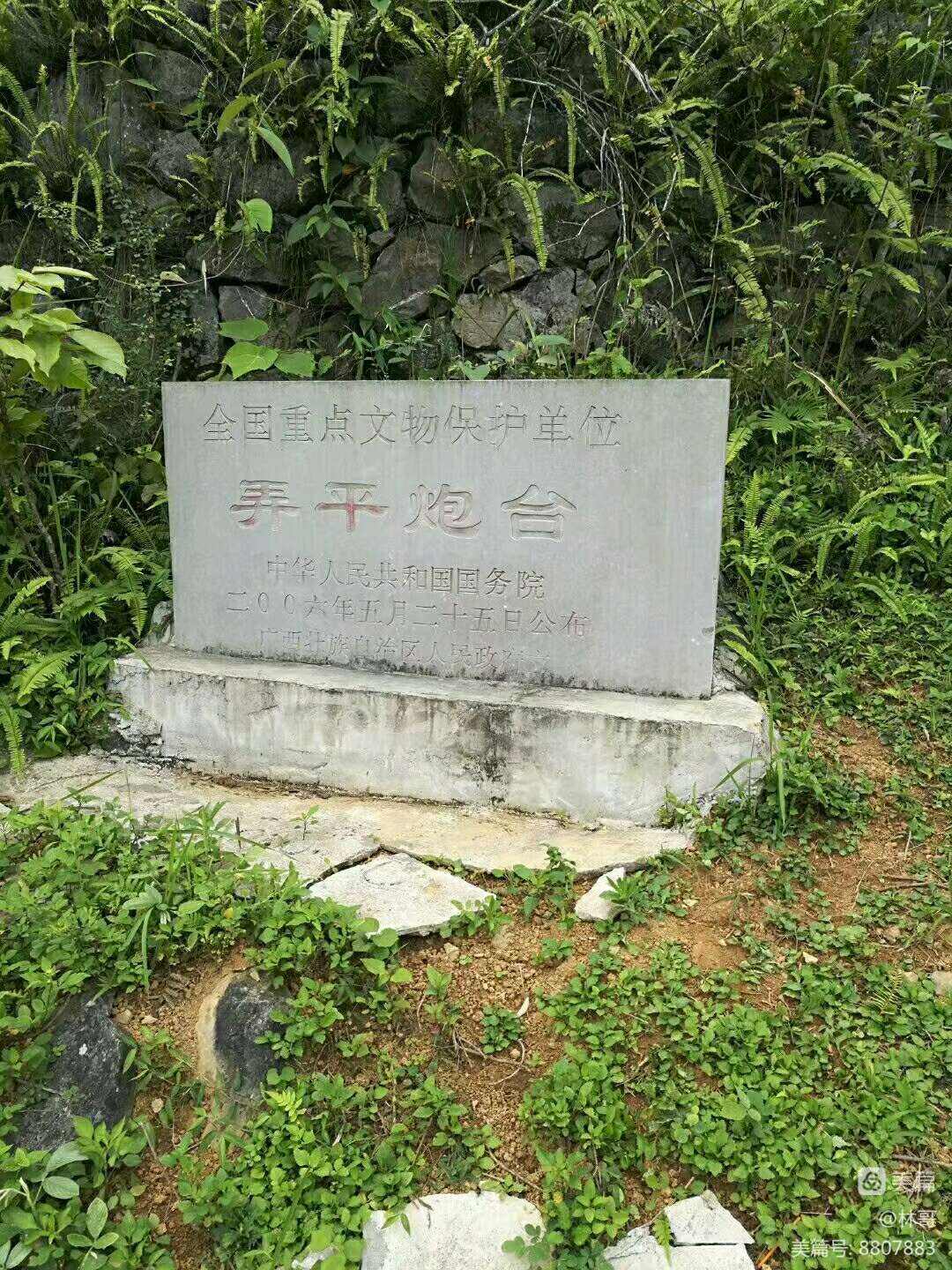 弄平古炮台,是清朝广西提督苏元春于光绪2 2 年(1 8 9 6 )建成的边关战地防御遗迹,也是苏元春在广西边境上构筑的1 6 5 个炮台中施工难度最大因而最后竣工的一个。现已被列为自治区级文物保护单位、革命传统教与爱国主义教育基地。登上古炮台,极目远眺,中越边寨山山水水全在脚下,可谓美丽风光尽收眼底,一览无遗。