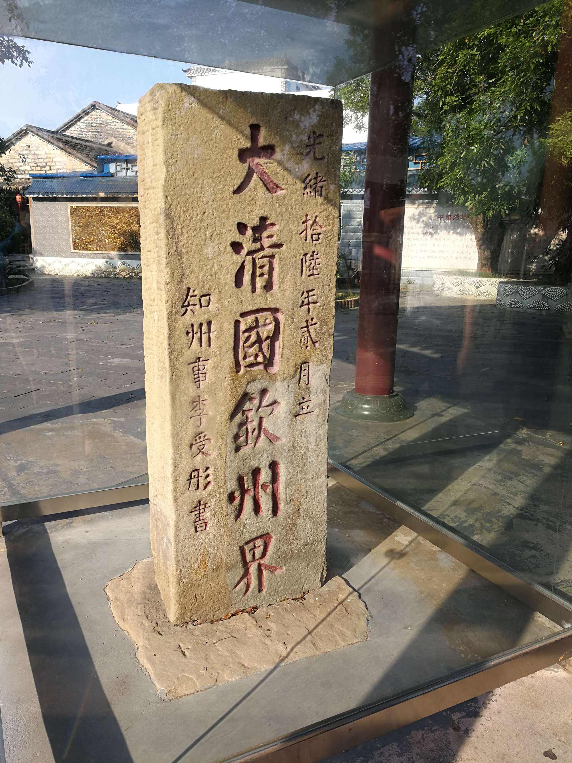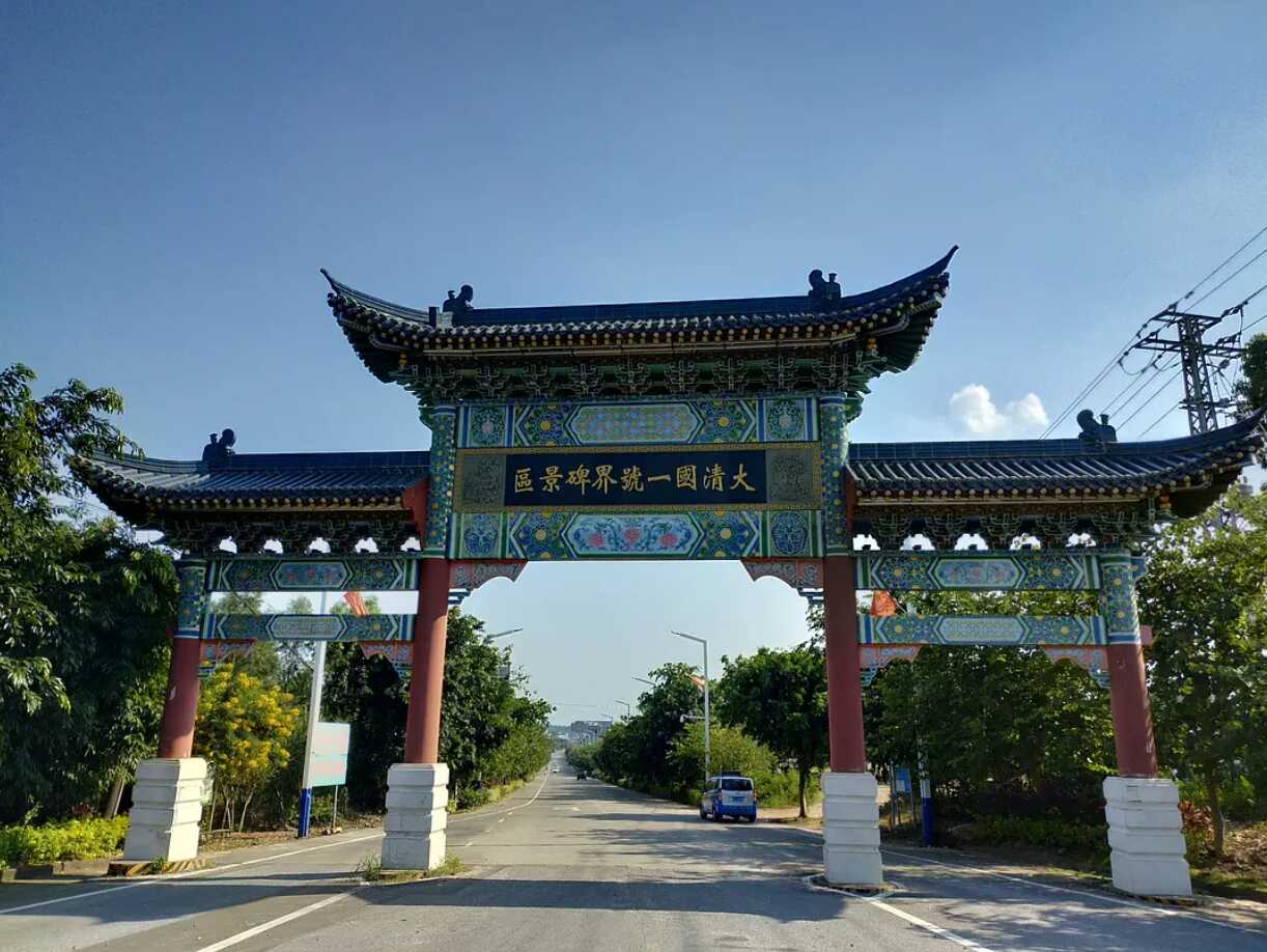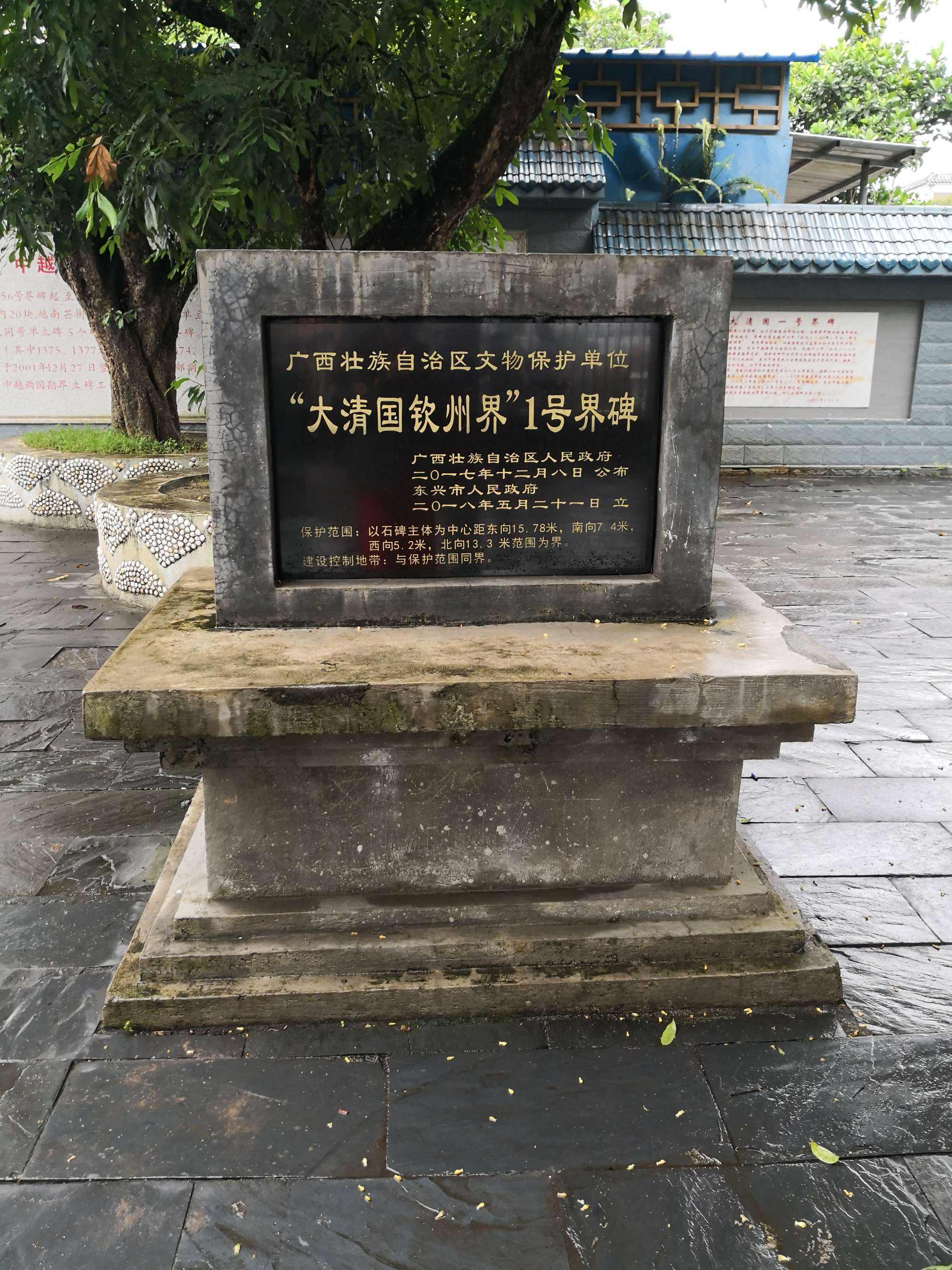 大清国一号界碑位于北仑河出海口的小山坡上,碑高1.7米,宽0.7米,厚0.4米,用沿海所产的海蚀岩凿成。界碑正面书“大清国钦州界·知州李受彤书·光绪十六年二月立”,涂着红漆的庄严雄浑的大楷碑文透着一股不可侵犯的凛然正气。这块饱受长年风吹日晒雨淋而益显沧桑的巨石,一直昂扬地巍然屹立着,向每一个游客诉说着100多年来的每一段历史。