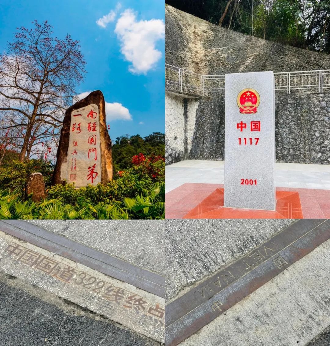南疆国门第一路(左上)。零公里1117号界碑(右上)。零公里国界线322国道终点(左下)。零公里国界线(右下)。图源:凭祥文旅体广局