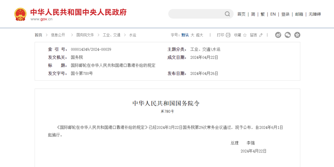 新华社北京4月26日电 国务院总理李强日前签署国务院令,公布《国际邮轮在中华人民共和国港口靠港补给的规定》(以下简称《规定》),自2024年6月1日起施行。