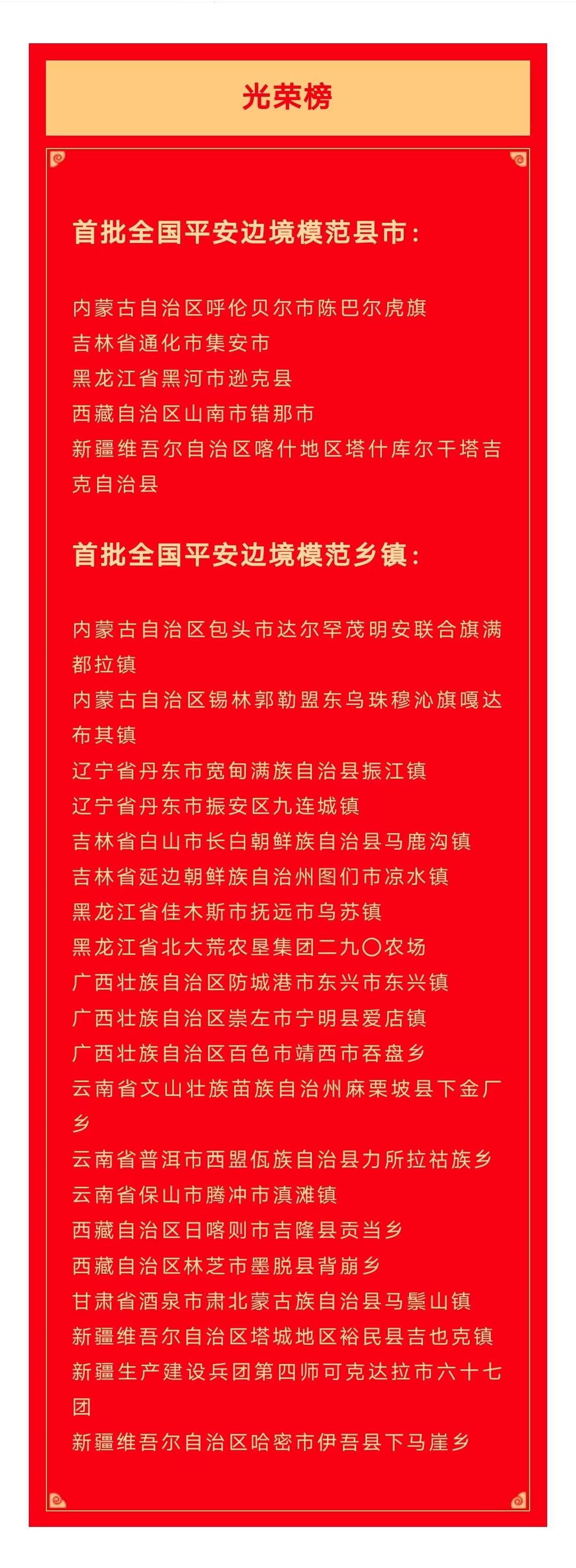 2月19日,由国家移民管理局、国家民委、农业农村部、国家边海防委员会办公室联合部署开展的平安边境模范系列创建活动在京举办创建经验交流会暨授牌。内蒙古自治区呼伦贝尔市陈巴尔虎旗等5个县市和云南省普洱市西盟佤族自治县力所拉祜族乡等20个乡镇获平安边境模范县市、乡镇命名。