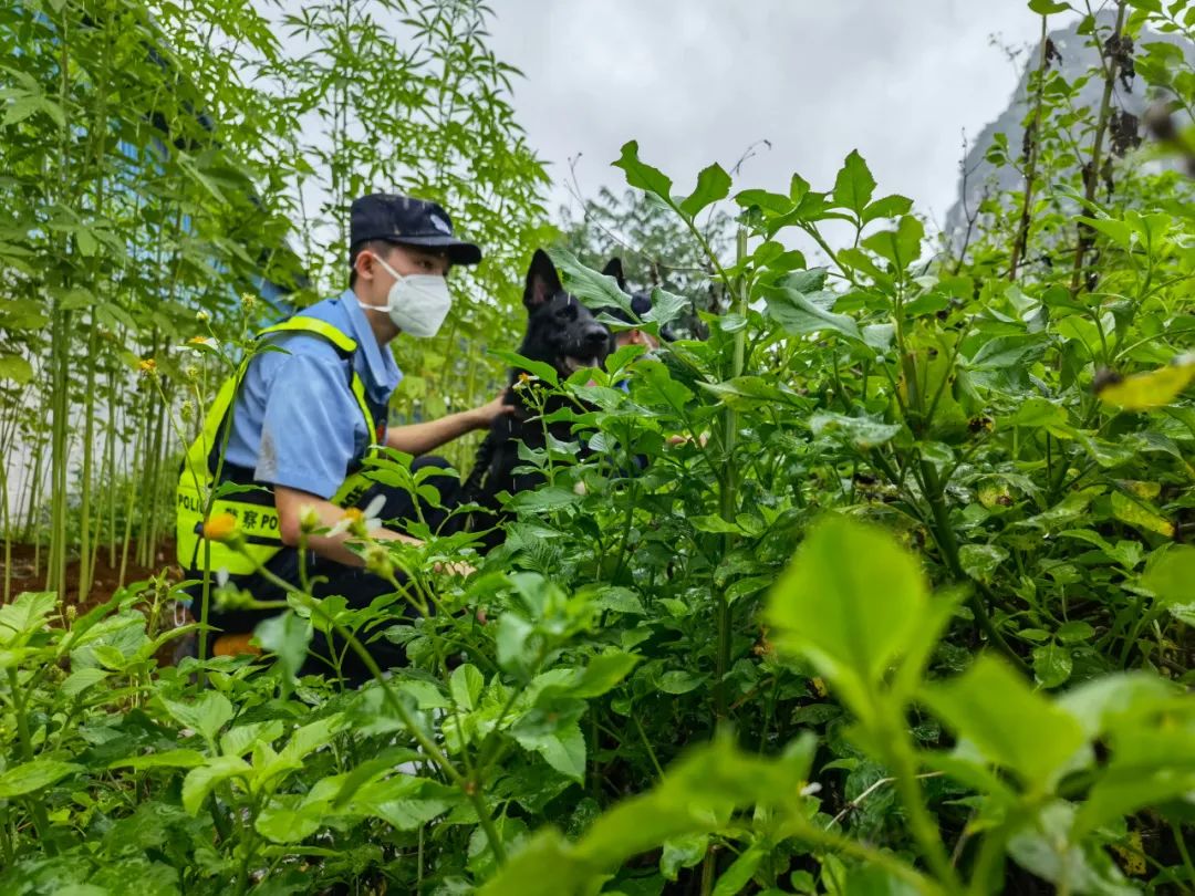 图/民警携带警犬在野外进行蹲守抓捕