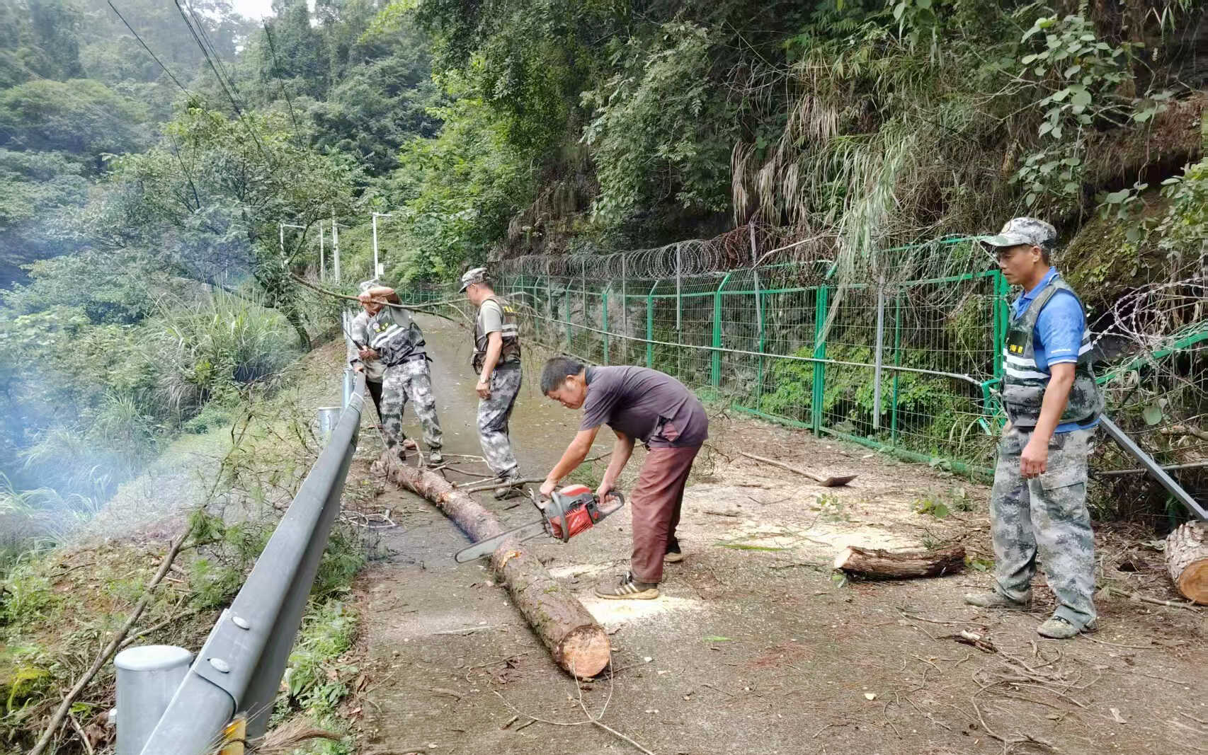 图为维护专班工作人员与护边员一起清理执勤道路边伏倒树木