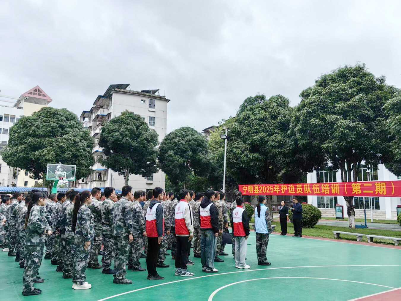 图为护边员队伍列队整齐后,宁明县国动办负责人作开课致辞