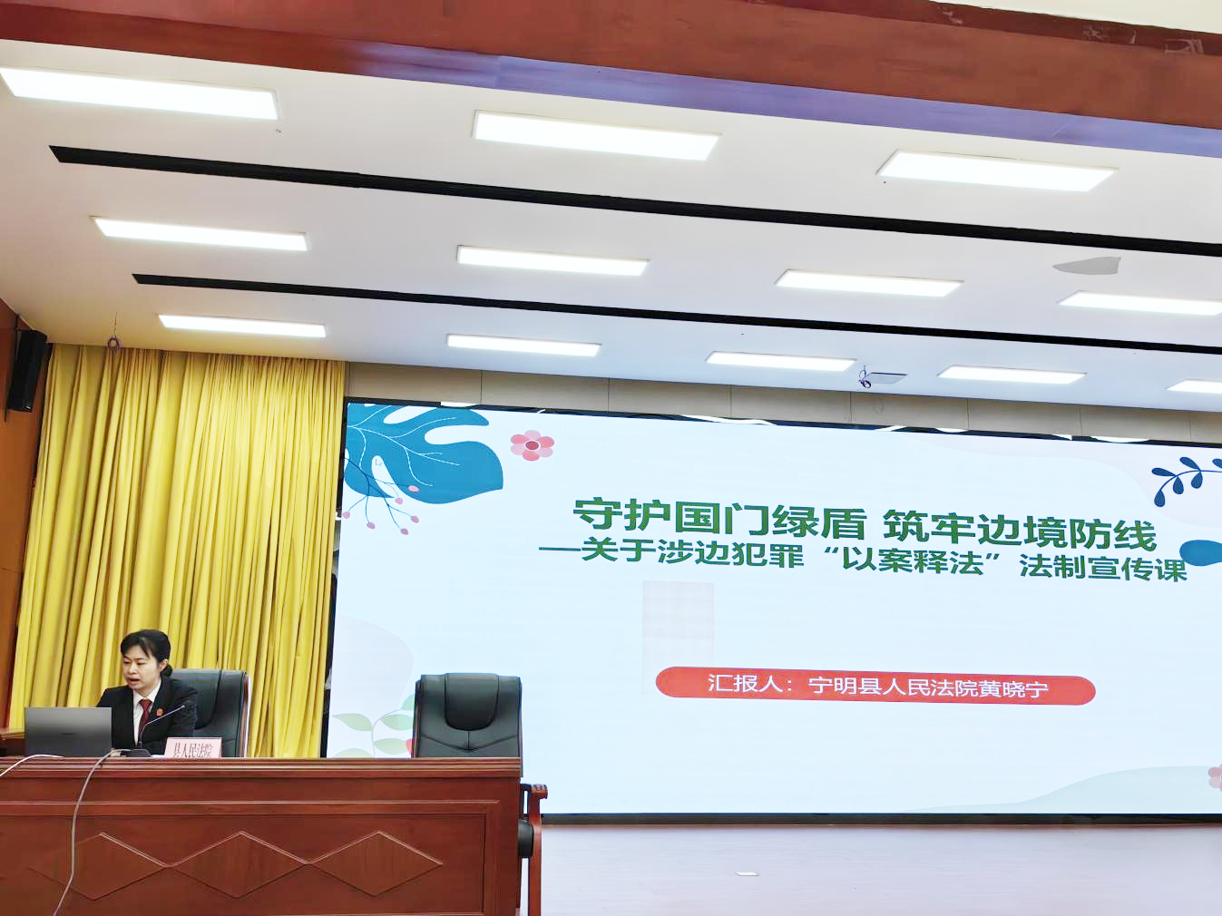 图为宁明县人民法院刑事审判庭庭长黄晓宁讲授涉边违法犯罪法制宣传课