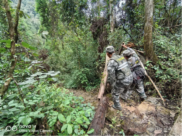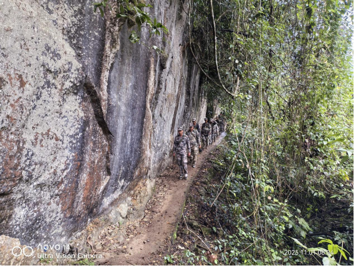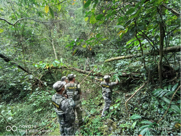 晨光初绽,靖西市壬庄乡的护边员队伍已然整齐集结。他们身着迷彩服,肩挎干粮和水,手持电锯、砍刀,向着781号界碑进发。这是一条往返需要徒步6小时的山路,位于邦亮长臂猿国家级自然保护区核心区,车辆无法通行,护边员的双脚是这里唯一的“交通工具”。