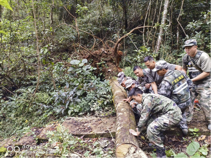“注意安全,两人一组,轮流作业!”护边员组长农明义的声音在山谷间回荡。巡逻道上,一棵直径约60厘米的大树横亘其间,枝干纵横,完全阻断了前进的道路。16名护边员立即投入清障工作。电锯轰鸣,砍刀起落,汗水很快浸透了他们的衣背。经过两个多小时的协力奋战,原本挡路的大树被分解成一根根整齐的木段,整齐码放在路边。