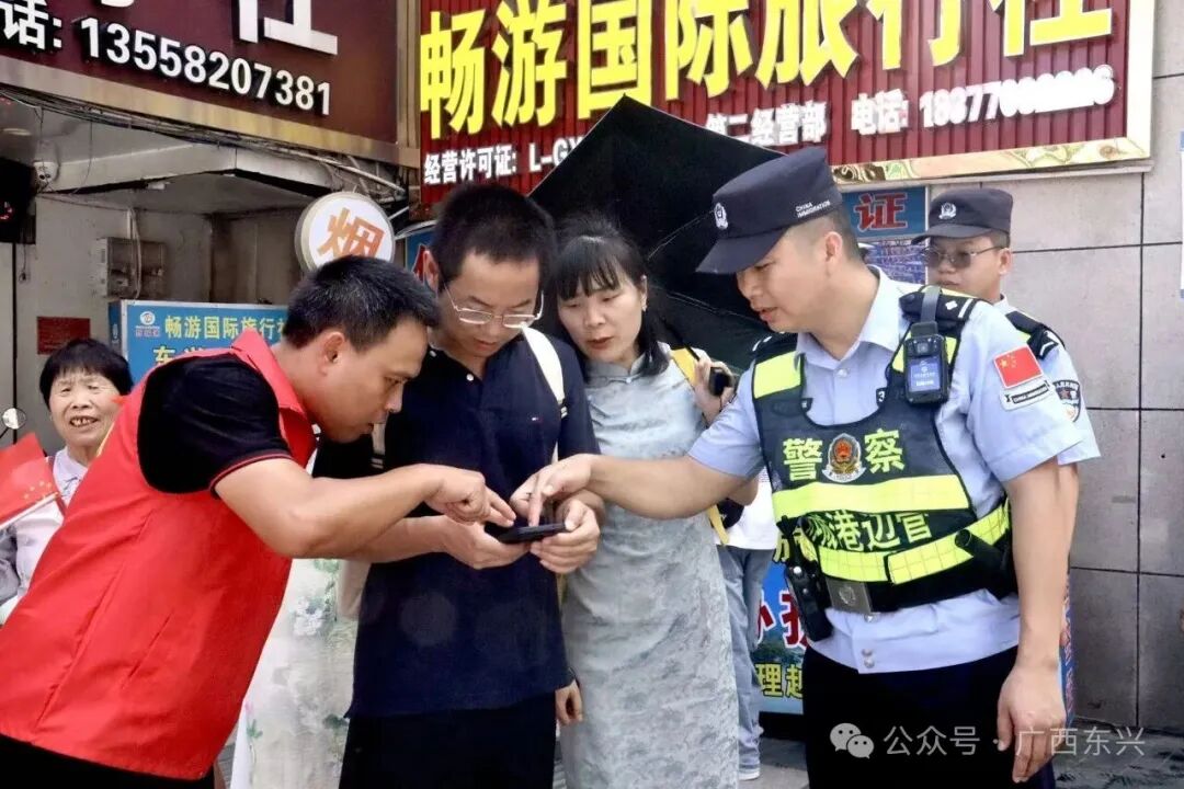 在东兴国门景区,派出所警员与社区干部共同维护景区秩序,为问路游客答疑。奚永丽 摄