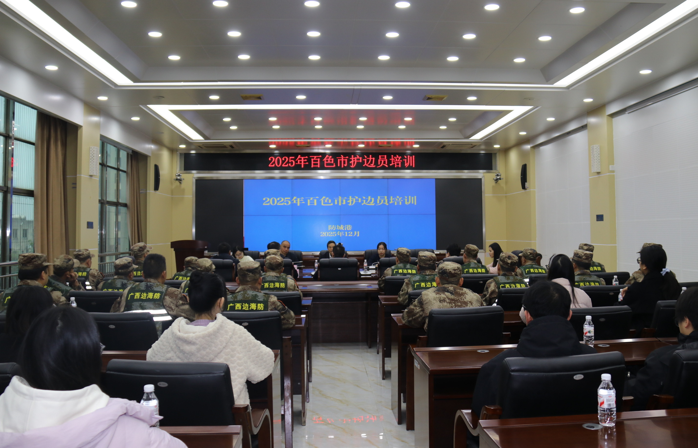 2025年12月28日至30日,百色市国动办组织一线护边员和青年护边指导员队伍共43人赴防城港市开展专题培训活动,通过“座谈交流+实地观摩”的模式,先后走进防城港市国动办和东兴市交东码头军警民联防所、竹山村山海相联地标广场、二号哨塔等地,淬炼卫国戍边职业精神,厚植爱国主义情怀,切实提升护边员履职能力,为守护祖国南疆注入强劲动力。