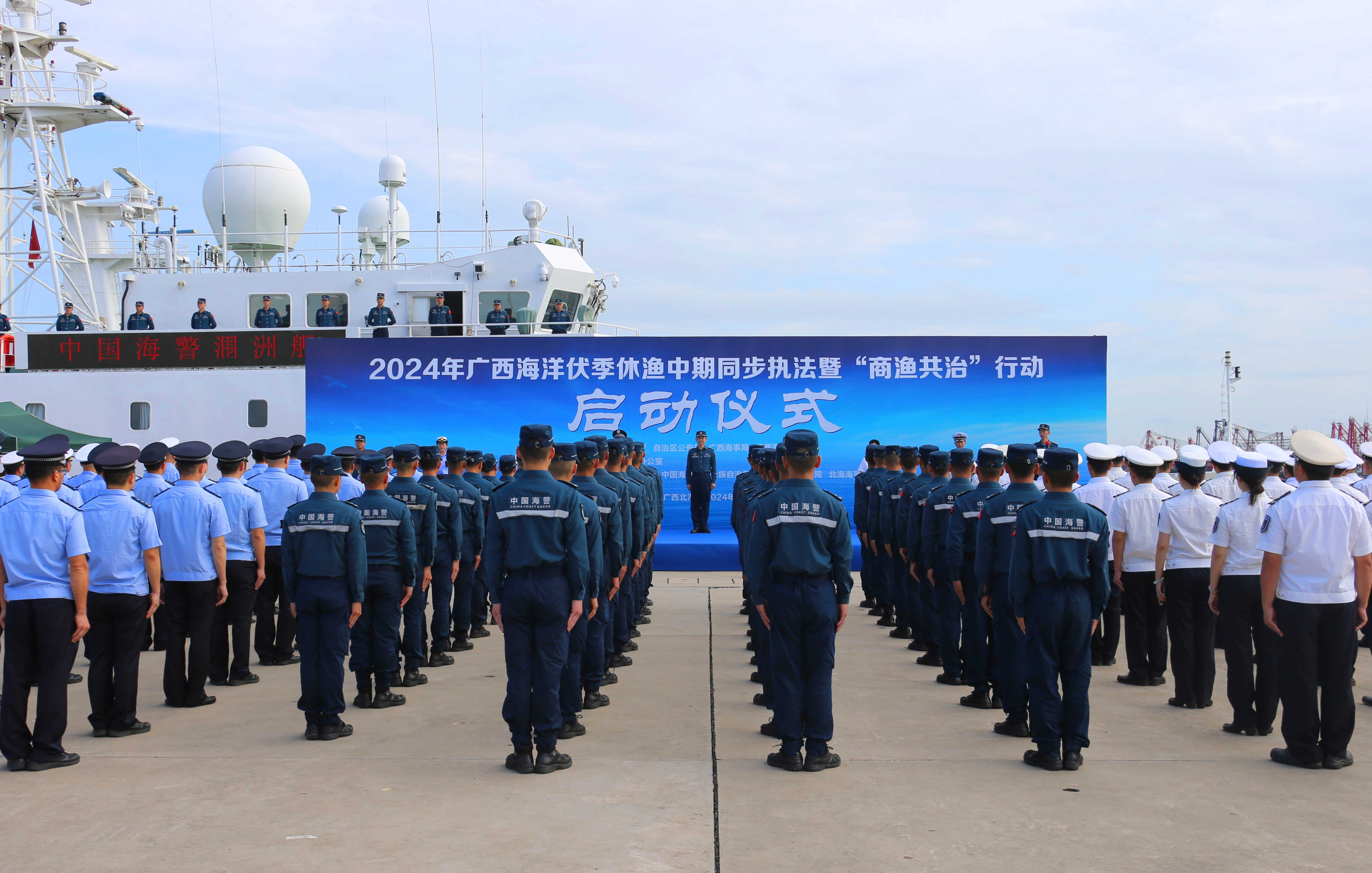 启动仪式上,自治区国动办、农业农村厅,广西海事局、海警局有关领导先后讲话,渔民代表和执法人员代表分别发言,表明坚决维护海洋权益、贯彻海洋伏季休渔制度、守护海上交通安全的鲜明态度,渔政、公安、海监、海事、海警执法人员整齐列队庄严宣誓,用铿锵有力的口号亮明维护海洋权益、打击非法捕捞、防范海上安全风险的坚定决心。随着指挥员一声令下,无人机迅速升空进行俯瞰巡查,执法人员有序登船,舰艇汽笛齐鸣,驶向任务海域开展执法巡航,2024年海洋伏季休渔中期同步执法“商渔共治”行动正式启动。