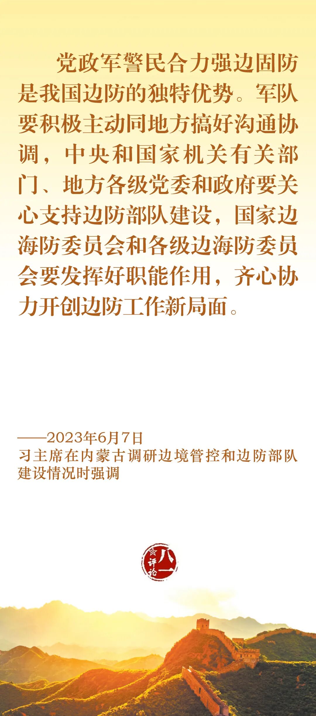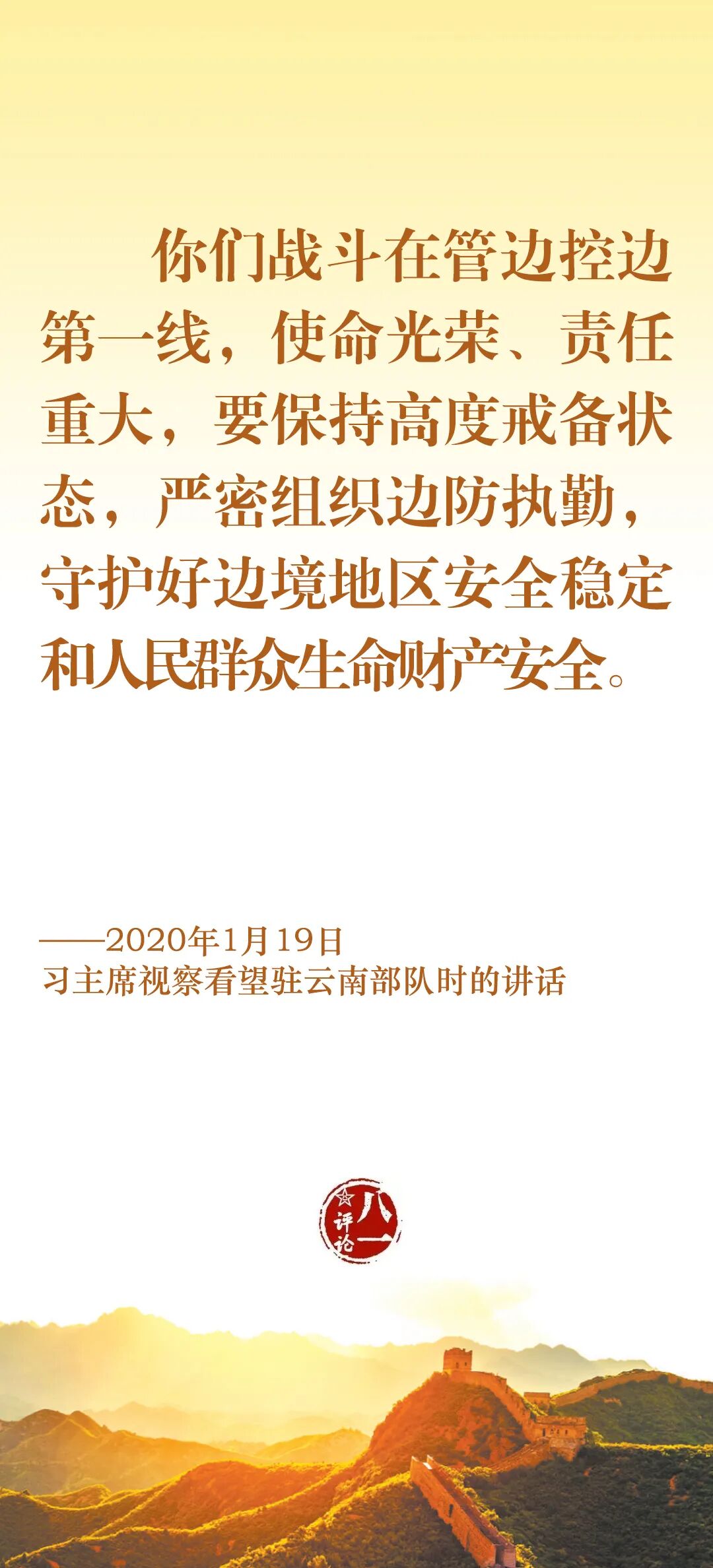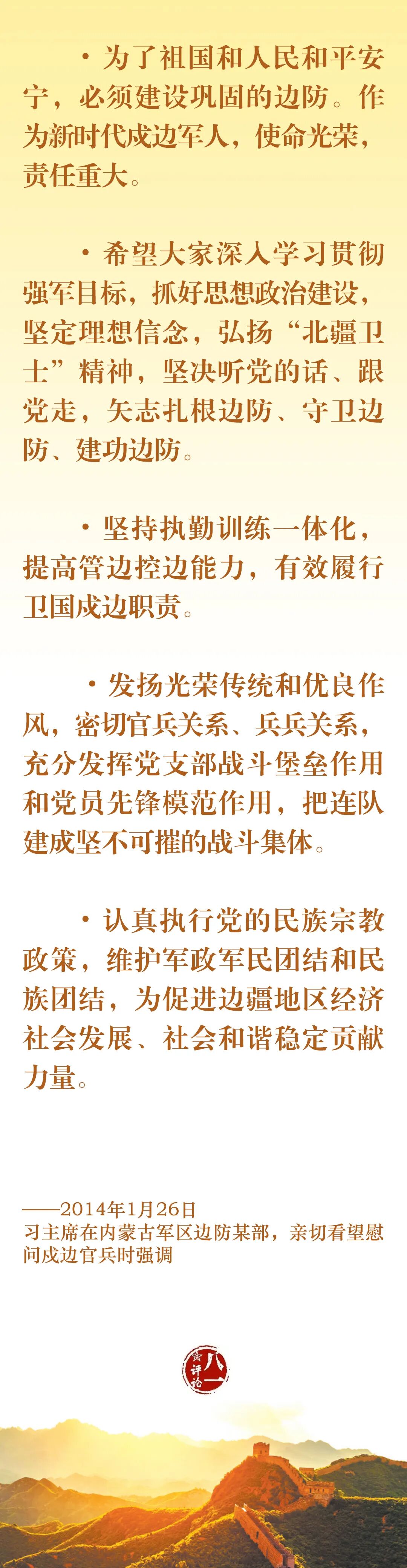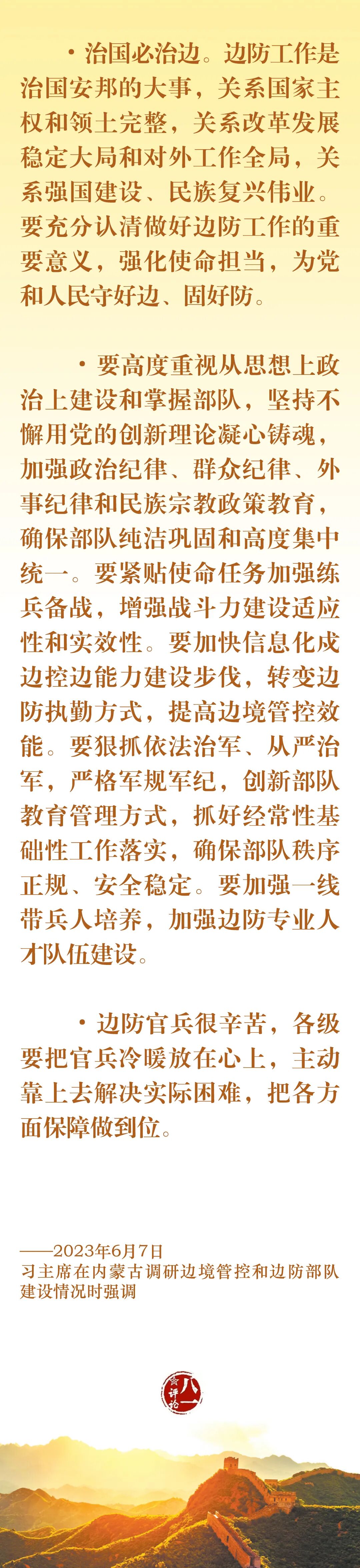 今天,我们一起认真学习习主席关于边防工作的部分重要论述,牢记使命职责,加强练兵备战,为党和人民守好边、固好防。