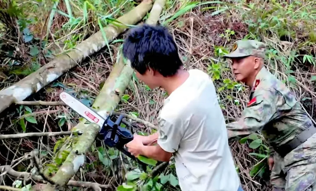 巡逻近半,远远就看到三棵碗口粗的树横亘在路面上。散发着清香的八角树,此时成了巡逻路上的“拦路虎”。陆兰军不慌不忙,边掏手机边说:“别着急,路上经常遇到,有‘援军’。”没过多久,“援军”到了——一个村民带着电锯从山下匆匆赶来。他和陆兰军边聊边干,短短十分钟,倒伏的大树就被清理掉了。“这就是边境线上我们常说的‘一个边民一个兵’,军民一家亲。”陆兰军笑着说。