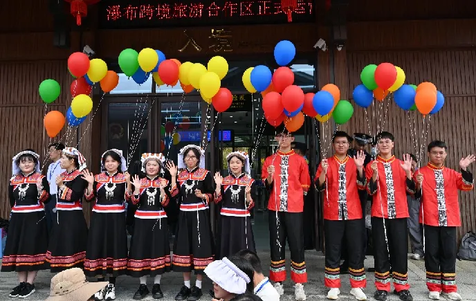 黄艳琴(左三)第一次穿壮族民族服饰,助力中越德天(板约)瀑布跨境旅游合作区正式运营启动仪式。