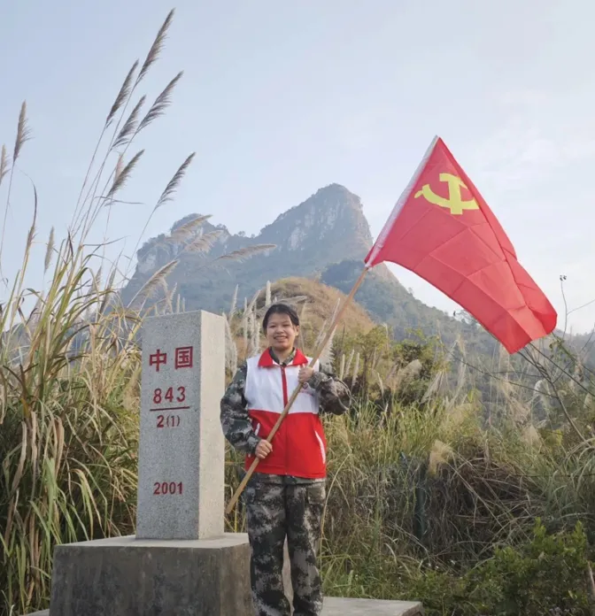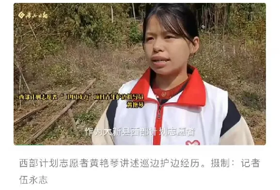 在大新,黄艳琴遇到了许多优秀的志愿者和领导同事,他们的良好品质深深吸引着她。刚参加巡边时,道路难行,楼梯难爬,界碑分布在不同环境,有在水里的,也有在山上的,除了正碑,还有无数副碑。但她看到一位 65 岁的护边员爷爷,每天背着砍柴刀走在巡边路上,爷爷说能守护祖国边疆安宁是非常有意义的事。爷爷坚韧的精神一直影响着黄艳琴,她希望自己能保持空杯心态,坚持独立思考,成为像爷爷一样坚定、有力量的人。