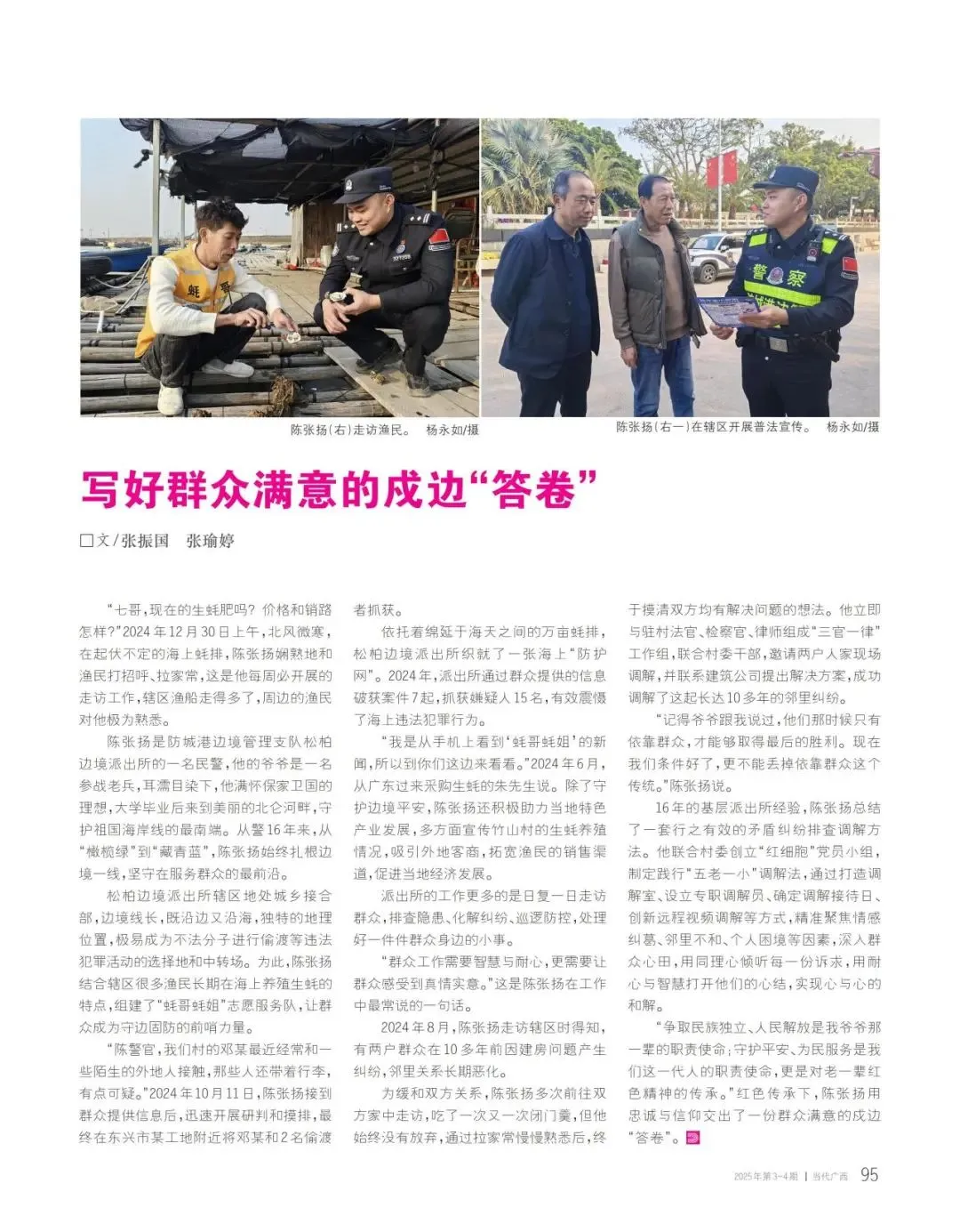 “我是从手机上看到‘蚝哥蚝姐’的新闻,所以到你们这边来看看。”2024年6月,从广东过来采购生蚝的朱先生说。除了守护边境平安,陈张扬还积极助力当地特色产业发展,多方面宣传竹山村的生蚝养殖情况,吸引外地客商,拓宽渔民的销售渠道,促进当地经济发展。派出所的工作更多的是日复一日走访群众,排查隐患、化解纠纷、巡逻防控,处理好一件件群众身边的小事。“群众工作需要智慧与耐心,更需要让群众感受到真情实意。”这是陈张扬在工作中最常说的一句话。2024年8月,陈张扬走访辖区时得知,有两户群众在10多年前因建房问题产生纠纷,邻里关系长期恶化。为缓和双方关系,陈张扬多次前往双方家中走访,吃了一次又一次闭门羹,但他始终没有放弃,通过拉家常慢慢熟悉后,终于摸清双方均有解决问题的想法。他立即与驻村法官、检察官、律师组成“三官一律”工作组,联合村委干部,邀请两户人家现场调解,并联系建筑公司提出解决方案,成功调解了这起长达10多年的邻里纠纷。“记得爷爷跟我说过,他们那时候只有依靠群众,才能够取得最后的胜利。现在我们条件好了,更不能丢掉依靠群众这个传统。”陈张扬说。