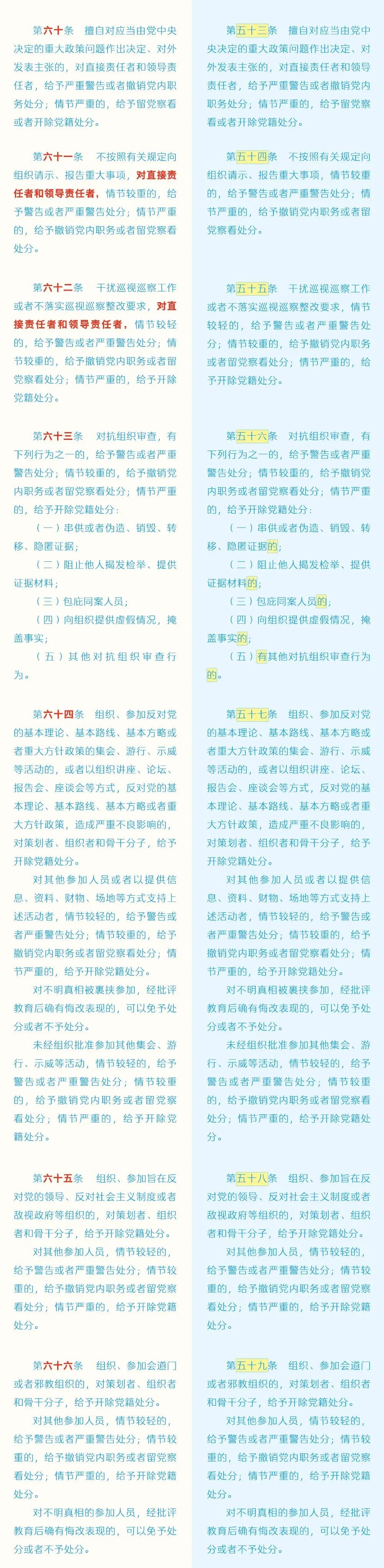 对违反组织纪律行为的处分共17条,新增2条,修改7条。一是推动落实新时代好干部标准。二是推动增强党员组织观念。三是推动服务人才强国战略。