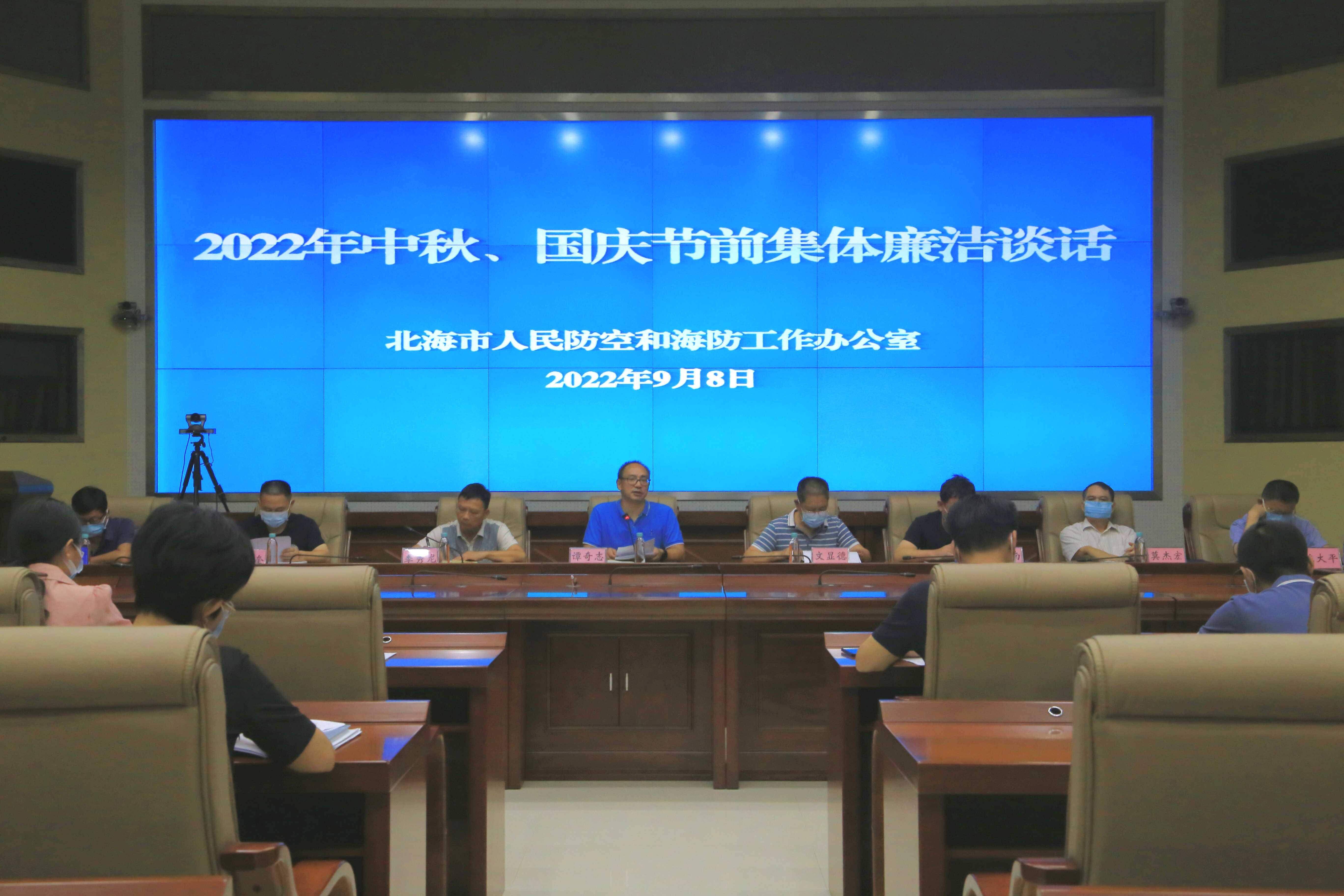 为进一步压实作风建设主体责任,切实加强党员干部教育管理监督,紧盯节点纠治“四风”工作,营造廉洁过节的良好氛围和风清气正的政治生态,9月8日,北海市人防海防办开展2022年中秋、国庆节前集体廉洁谈话,办党组书记、主任谭奇志主持,全体干部职工参加。